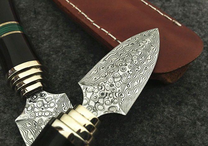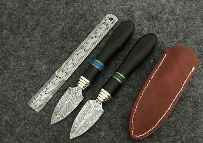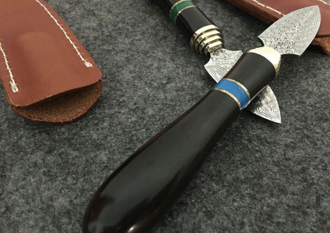 大马士革蓝鸟茶叶刀 全 长:16.5cm 刃 长:4cm 柄 长:11.5cm 刃 宽:2.2cm 刃 厚:3mm 刃 材:大马士革 重 量:130含包装) 硬 度:58HRC 表 面:大马士革原色 柄 材:铜头+兽骨+檀木