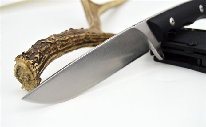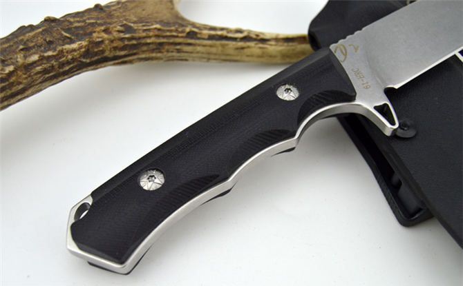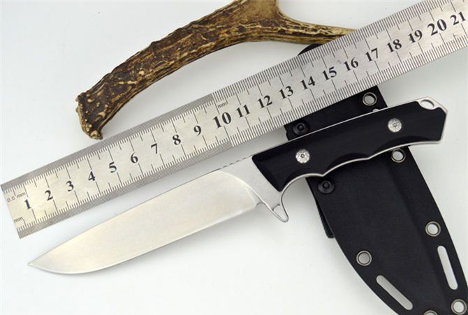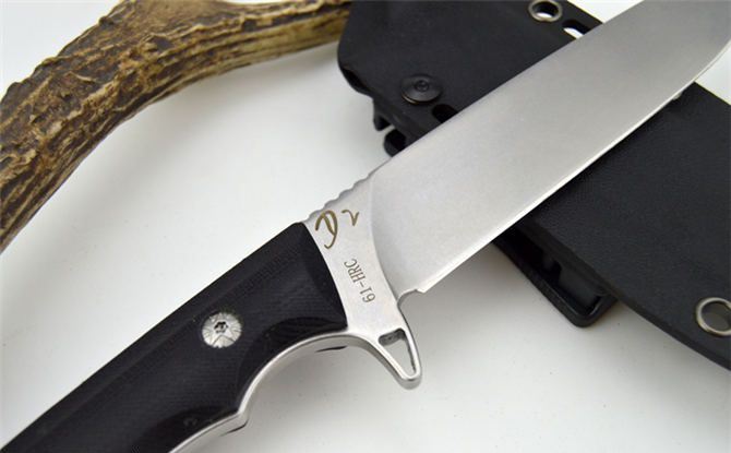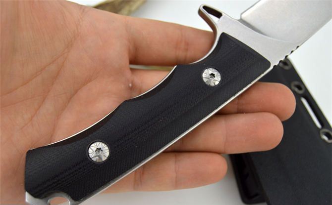 默直刀D2钢求生刀 总长:19.5CM 刃长:909CM 刃厚:0.5CM 刀刃硬度:61HRC 刃材:进口D2钢 表面:精幼砂光后石洗处理 柄长:9.5CM 柄材:黑色G10 包装:K鞘 重量:220克