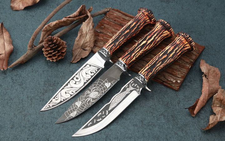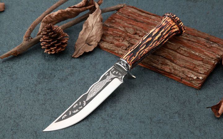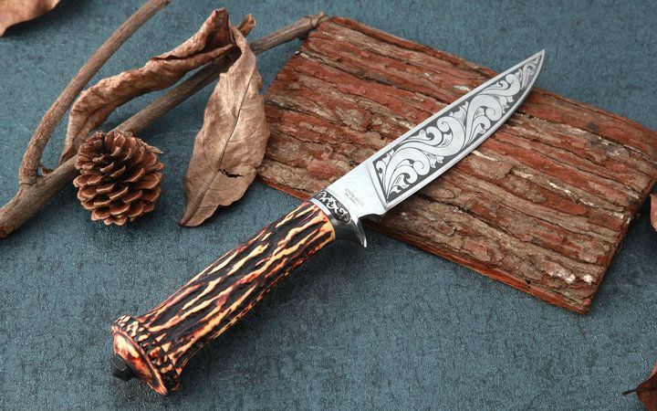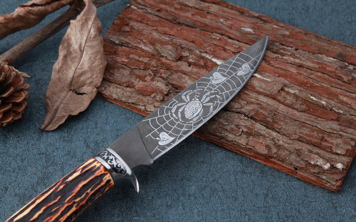 FB969户外直刀三款 全长:28.5cm 刃长:15.2cm 柄长:12.8cm 刃厚:0.29cm 刃宽:3.0cm 刃材:5CR15MOV 柄材:花纹钢头+防骨柄 硬度:57HRC 净重:250克(含包装) 锁定:直锁 表面处:沙光(浪花+蜘蛛+鱼鱼)三款图案,下单注明