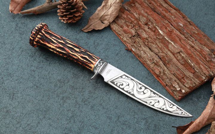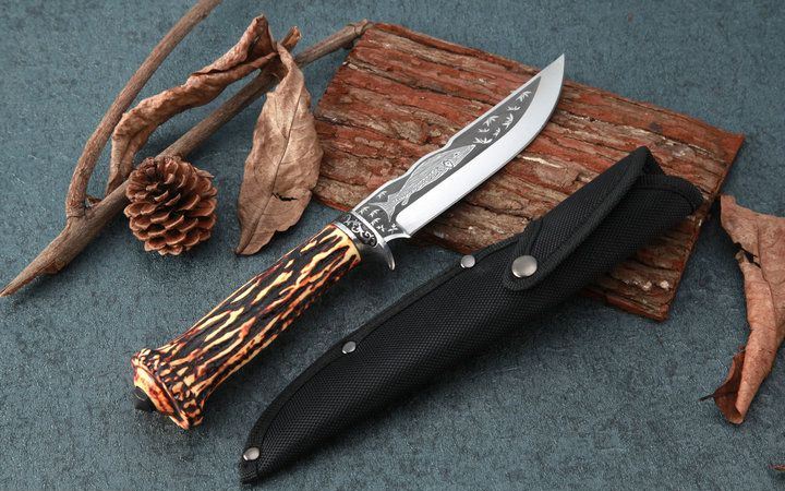 FB969户外直刀三款 全长:28.5cm 刃长:15.2cm 柄长:12.8cm 刃厚:0.29cm 刃宽:3.0cm 刃材:5CR15MOV 柄材:花纹钢头+防骨柄 硬度:57HRC 净重:250克(含包装) 锁定:直锁 表面处:沙光(浪花+蜘蛛+鱼鱼)三款图案,下单注明 其他:原厂尼龙套