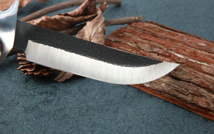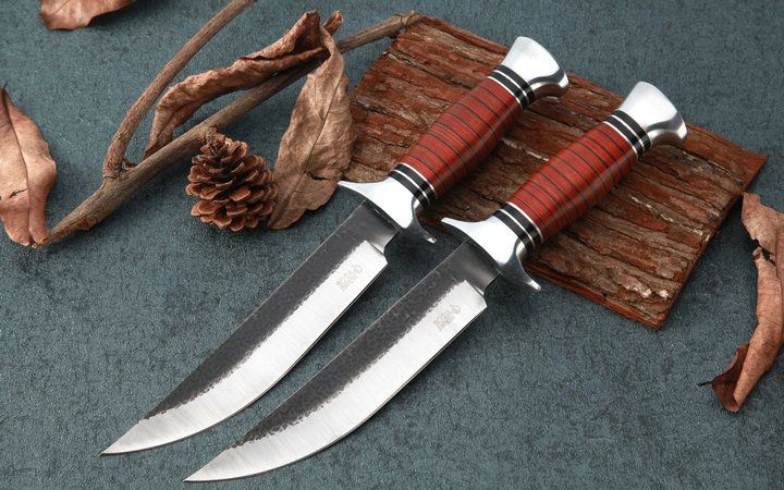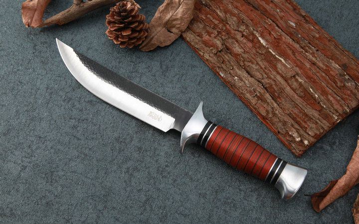 FB01B户外锻打直刀 全长:30.2cm 刃长:18.0cm 柄长:12.2cm 刃厚:0.31cm 刃宽:3.2cm 刃材:5CR15MOV 柄材:双钢头护手+防骨彩木手柄 硬度:57HRC 净重:250克(含包装) 锁定:直锁 表面处:沙光锻打纹