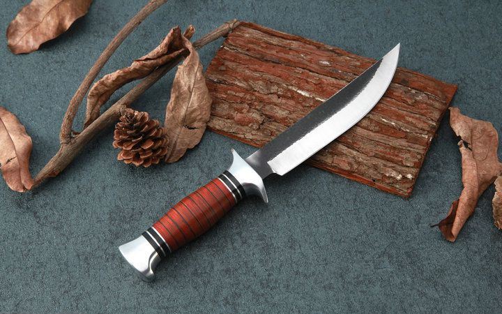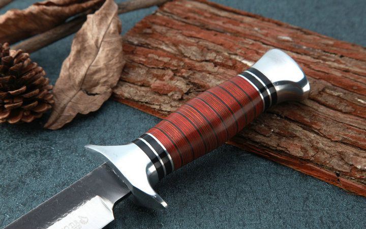 FB01B户外锻打直刀 全长:30.2cm 刃长:18.0cm 柄长:12.2cm 刃厚:0.31cm 刃宽:3.2cm 刃材:5CR15MOV 柄材:双钢头护手+防骨彩木手柄 硬度:57HRC 净重:250克(含包装) 锁定:直锁 表面处:沙光锻打纹 其他:原厂尼龙套