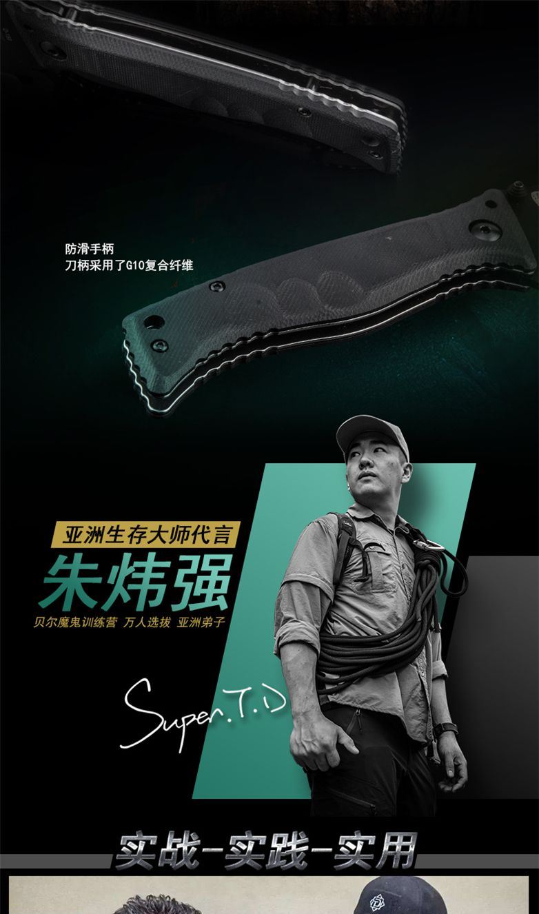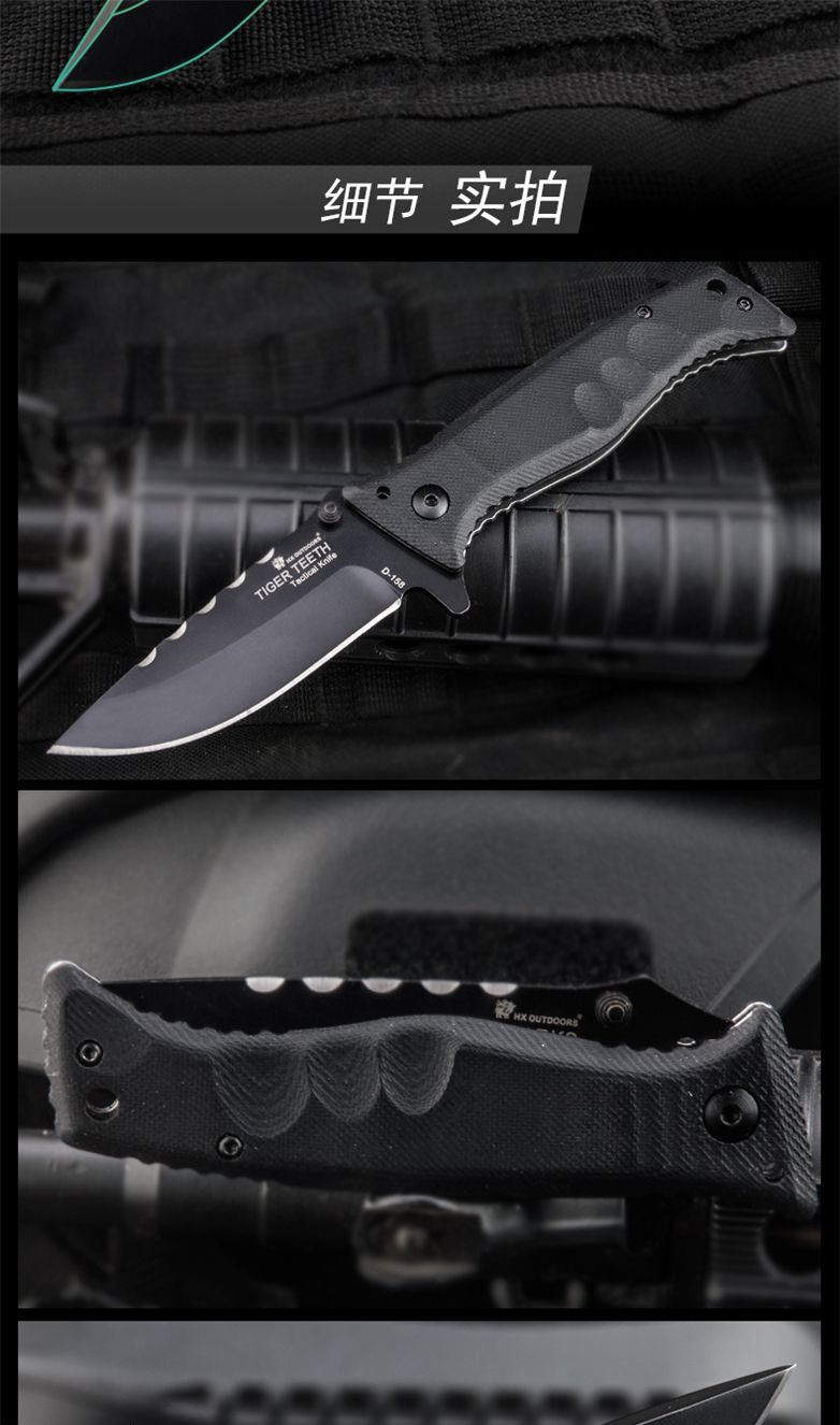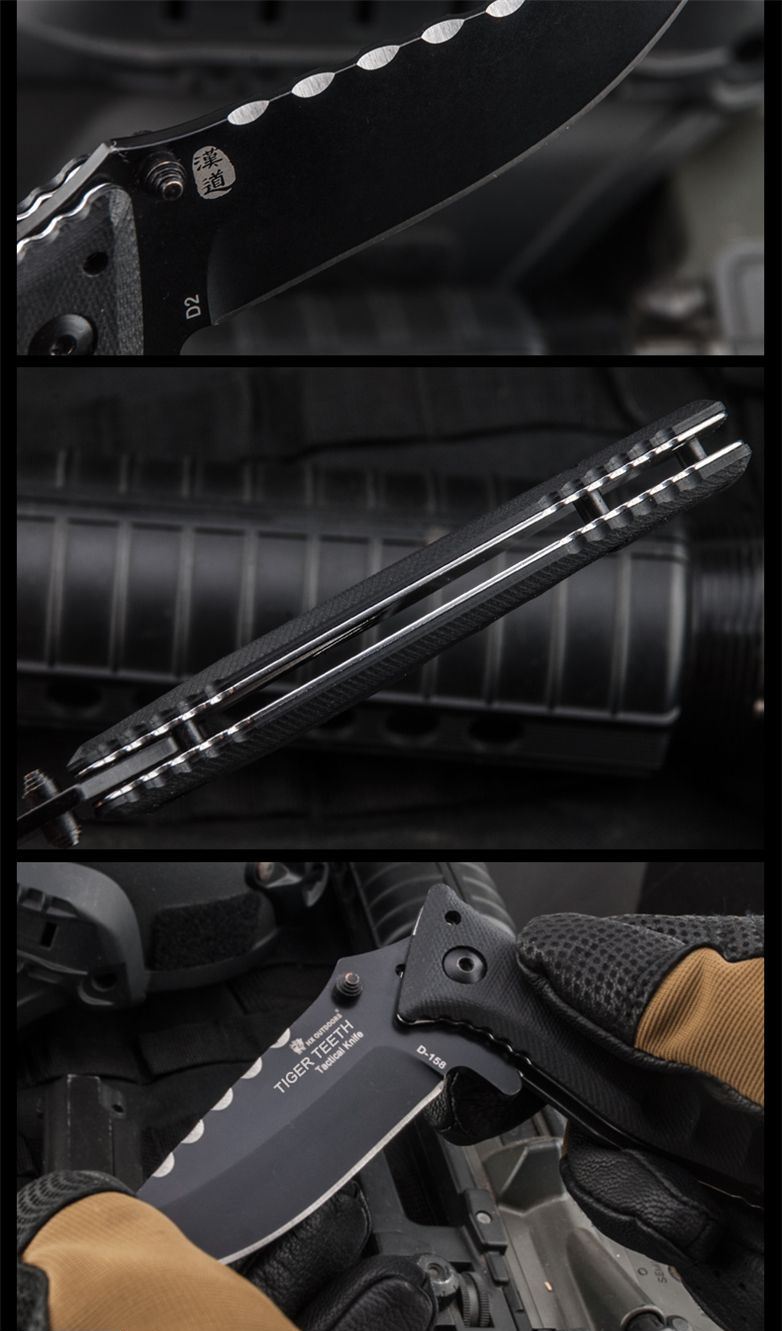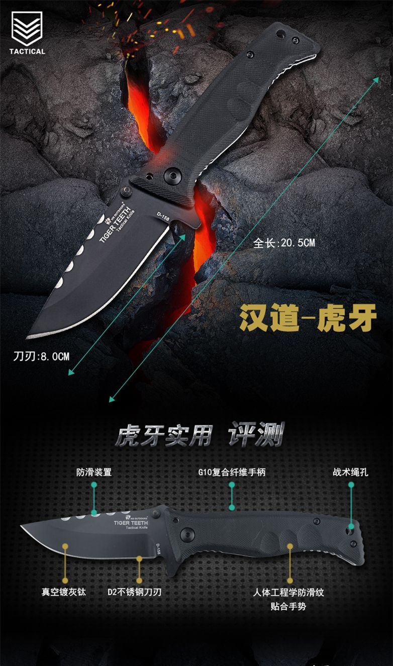 汉道虎牙折叠刀 全长:20.5CM 刃长:8.0CM 刃材:D2钢 刀刃表面处理:真空镀灰钛 刀背:防滑装置 刀柄:G10复合纤维