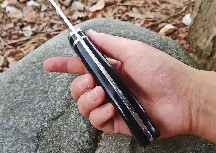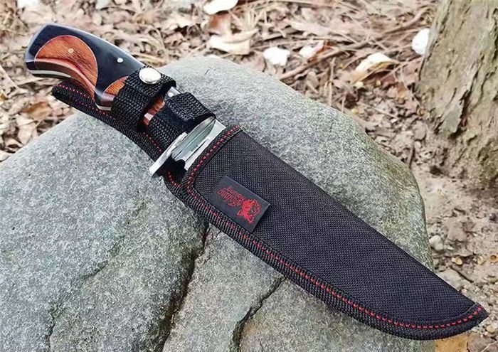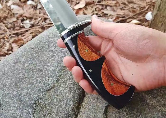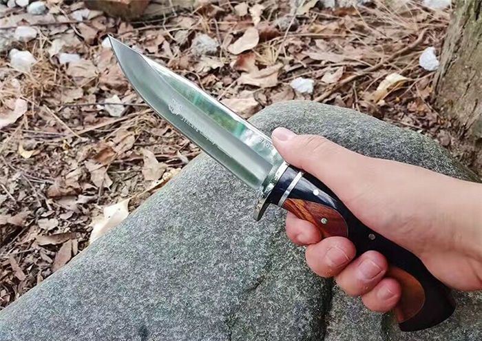 全 长:31.5cm 刃 长:18cm 刃 宽:3.6cm(最宽处) 刃 厚:3.9mm 柄 长:13.5cm 表 面:拉丝+镜光 刃 材:CR13 硬 度:57HRC 柄 材:双钢头雕花+进口彩木 重 量:376克(含包装) 包 装:尼龙套