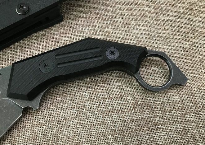 挺进者Strider乌鸦搏击爪刀 全 长:21cm 刃 长:10cm 柄 长:10.7cm 刃 宽:4.4cm 刃 厚:0.46cm 刃 材:7Cr17Mov 重 量:190g(单刀) 硬 度:58-59HRC(真空油冷热处理) 表 面:沧桑石洗 柄 材:黑色G10
