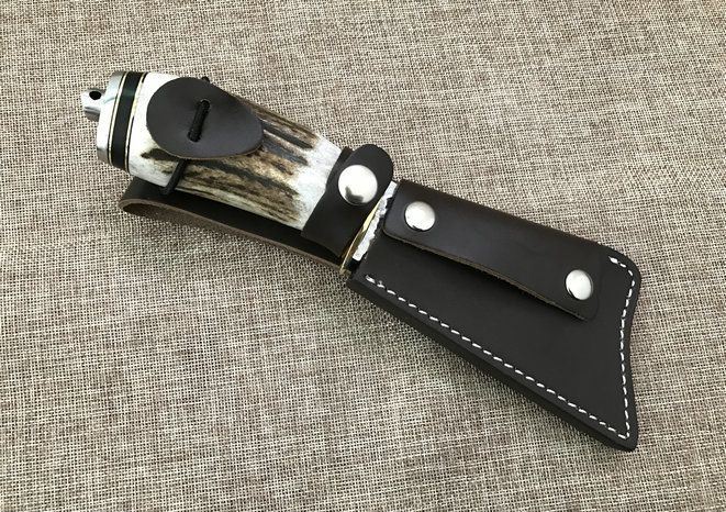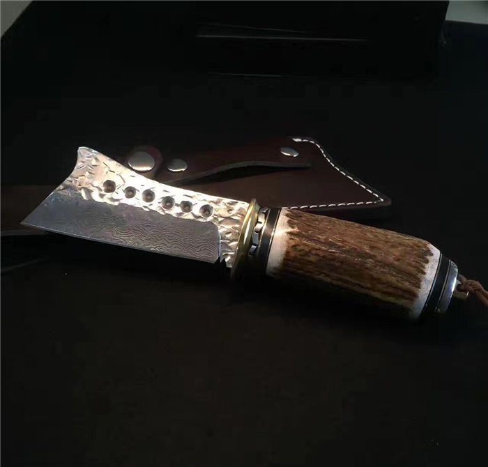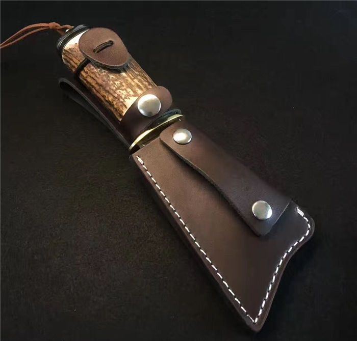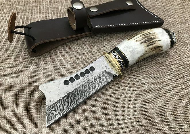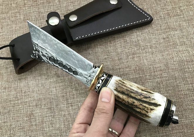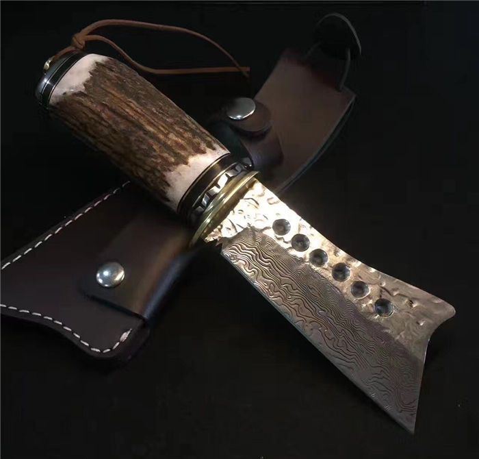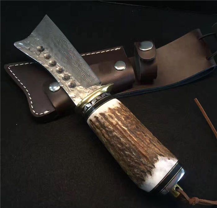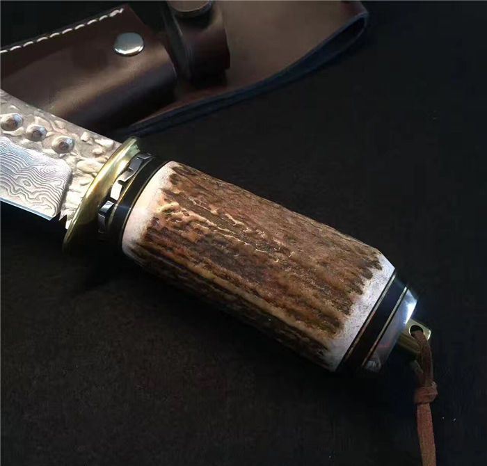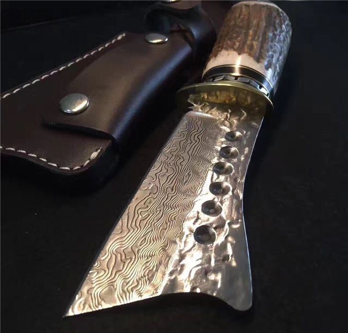 野猪鹿角大马士革直刀 全长:25cm 刃长:11cm 厚度:4mm 刀材:大马士革钢 手柄用料:纯黄铜+粗鹿角 硬度:59-60HRC、耐砍-乃磨等 配牛皮刀套