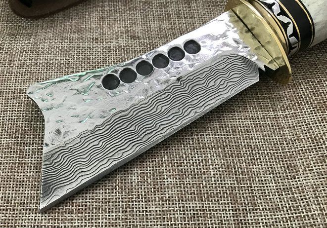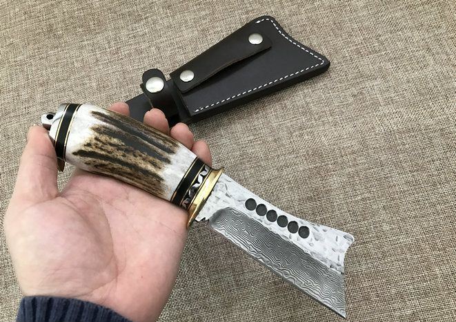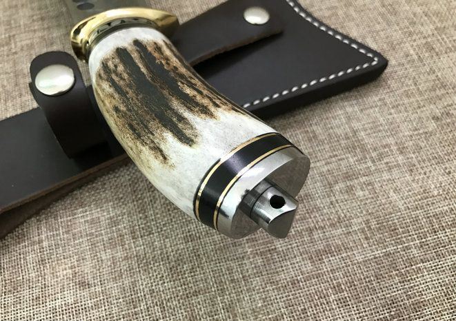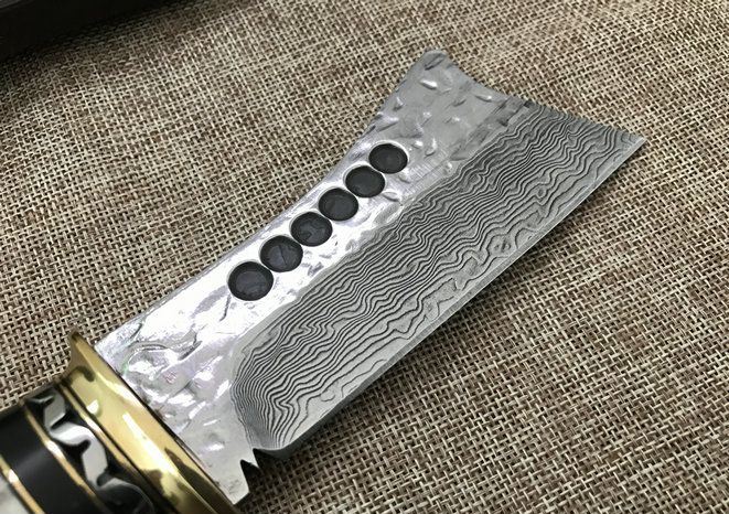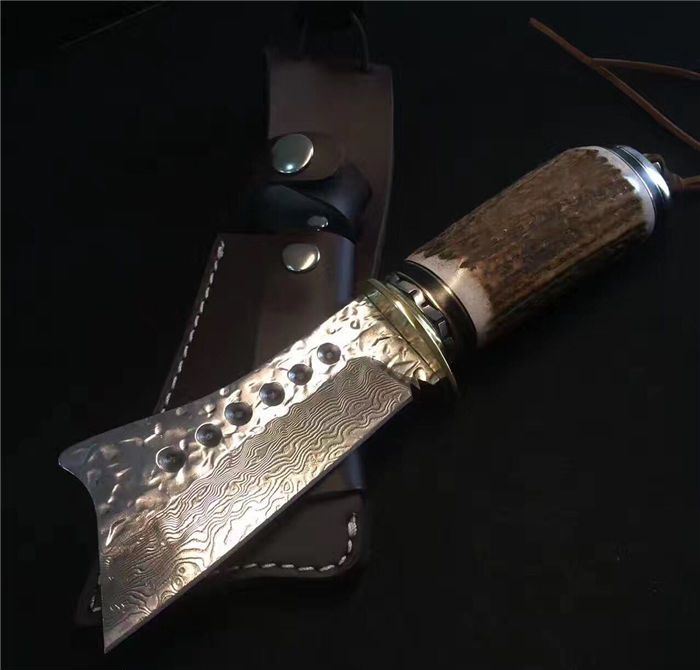 全长:25cm 刃长:11cm 厚度:4mm 刀材:大马士革钢 手柄用料:纯黄铜+粗鹿角 硬度:59-60HRC、耐砍-乃磨等