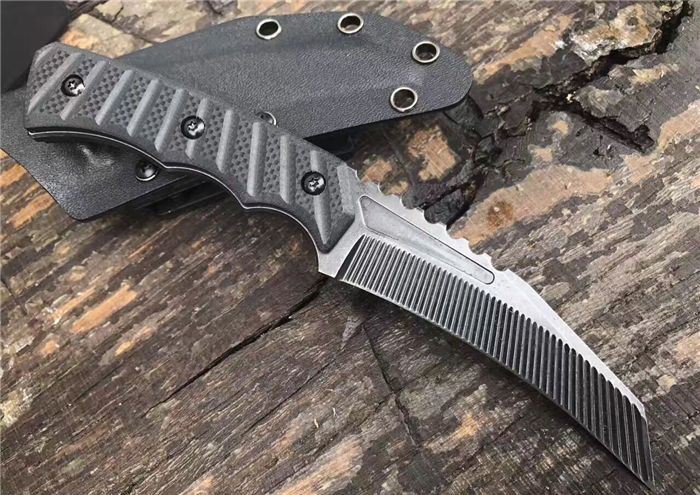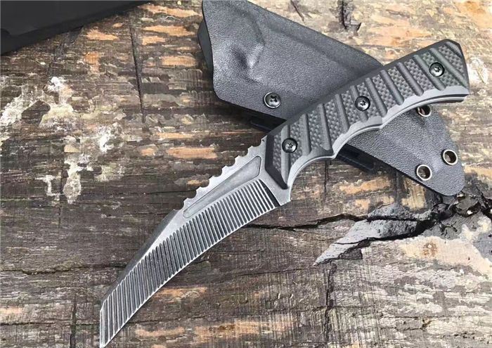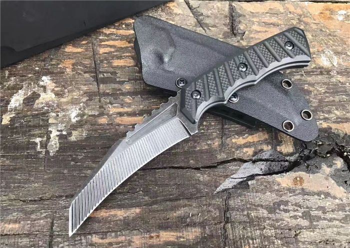 吉姆防卫爪刀 全 长:21m 刃 长:10.3cm 柄 长:10.7cm 刃 宽:0.31cm 刃 厚:0.55cm 刃 材:D2 重 量:220g 硬 度:58HRC 表 面:沧桑石洗 柄 材:黑色G10 其 他:礼品盒+K鞘