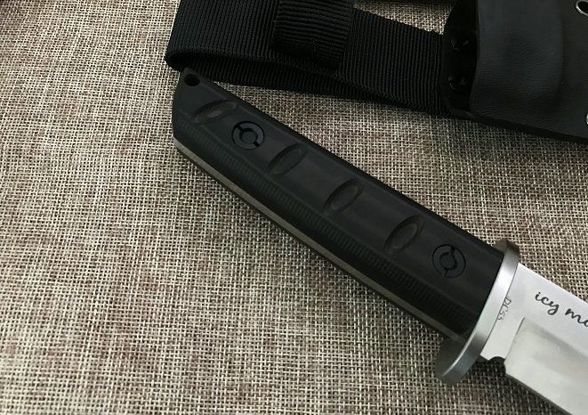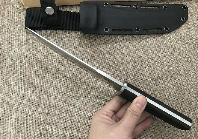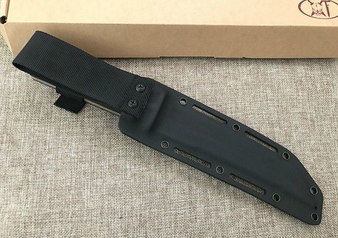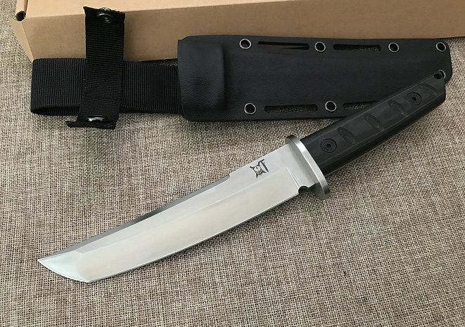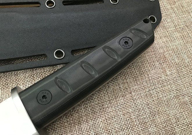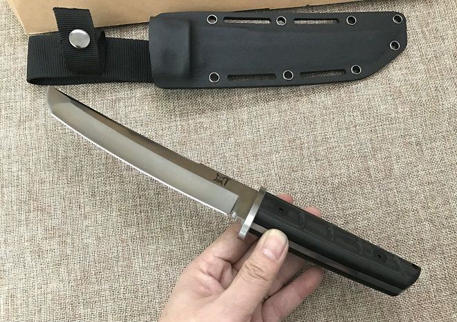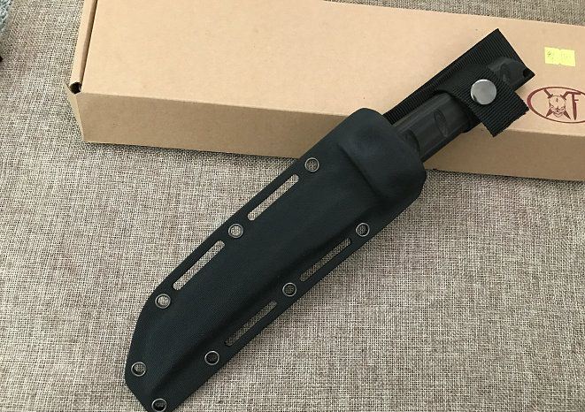 材料: DC53 总长度: 303MM 厚度: 5.2MM 刃长: 180MM 柄长: 118MM(含护手长123MM) 刃宽: 35MM 护手宽: 50.5 刀条采用手工精细砂光和石洗 硬度: 60+(真空热处理)真空处理韧性非常好 柄材: 黑绿美卡塔&黑红美卡塔(3D立体型面-握感饱满) 12.9级战术锣丝 刀鞘: 2.0Kydex鞘(进口料)