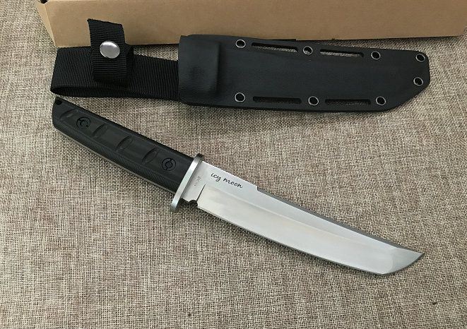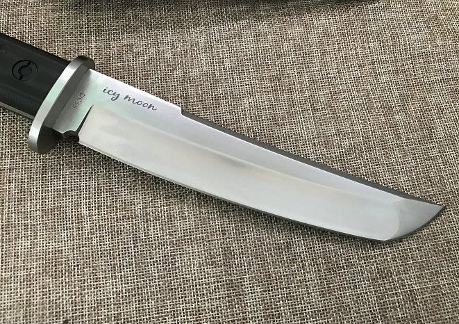 冷月日式中直刀 材料: DC53 总长度: 303MM 厚度: 5.2MM 刃长: 180MM 柄长: 118MM(含护手长123MM) 刃宽: 35MM 护手宽: 50.5 刀条采用手工精细砂光和石洗 硬度: 60+(真空热处理)真空处理韧性非常好 柄材: 黑绿美卡塔&黑红美卡塔(3D立体型面-握感饱满) 12.9级战术锣丝 刀鞘: 2.0Kydex鞘(进口料)