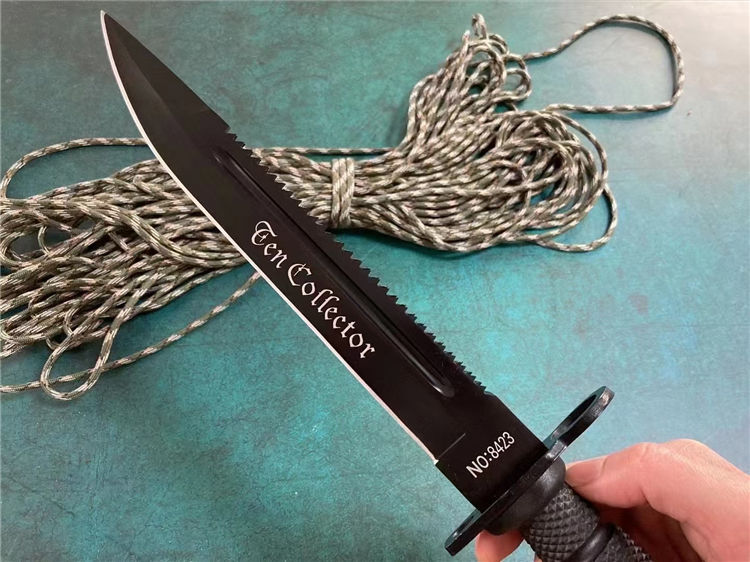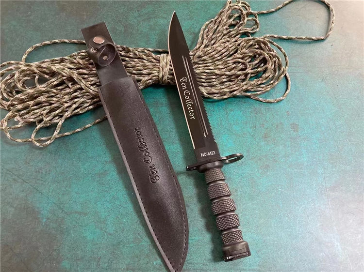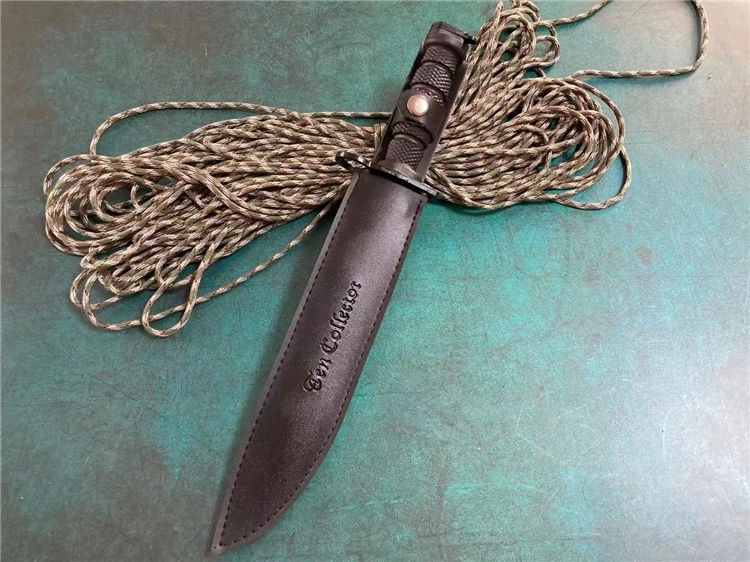 黑色95刺勇士直刀 全长:38cm 重量:500克 刃长:26cm 刃厚:0.5cm 刃料:5CR15MOV 刀鞘:PU皮套