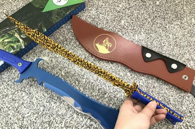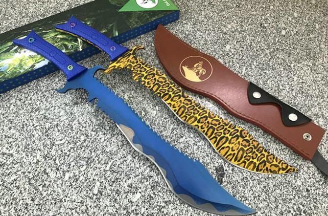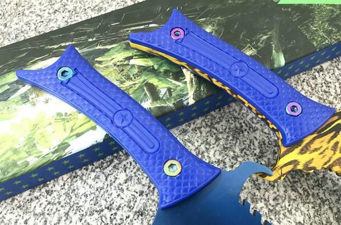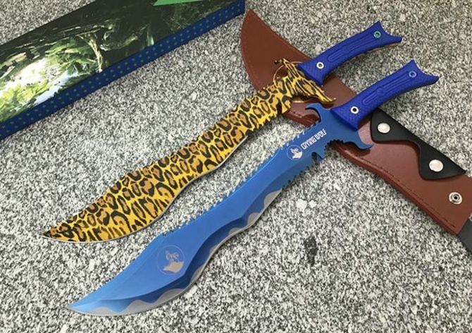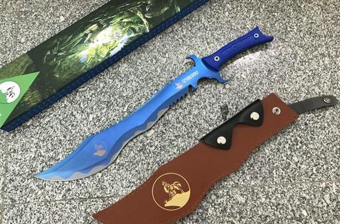 深海异形鲨砍刀 全长:47.5cm 刃长:30.2cm 柄长:15.2cm 刃厚:0.5cm 刃宽:8cm 刃材:9CR18 柄材:Abs 硬度:59-60HRC 净重:580克 刀鞘:高品质皮套