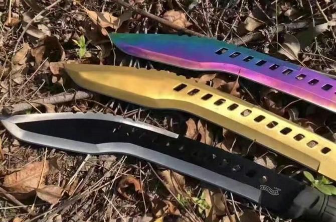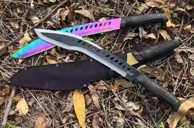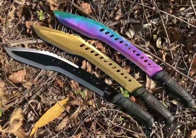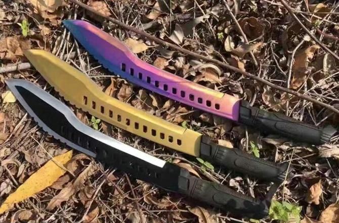 暗箭弯刀(彩钛、黄金) 全长:52cm 刃长:38cm 柄长:14.5cm 刃厚:4.6mm 刃宽:6cm 刃材:5Cr13 柄材:ABS 硬度:55HRC 净重:610克 毛重:920克(含包装物) 表面处理:氧化