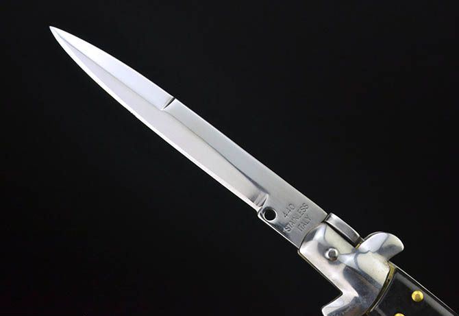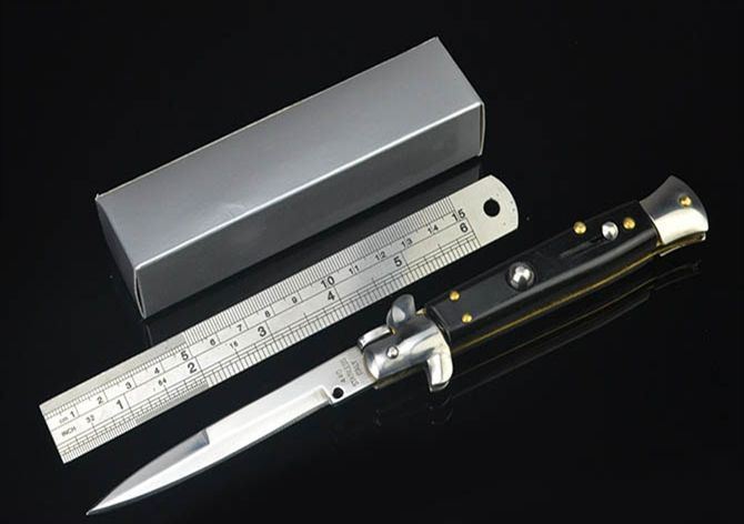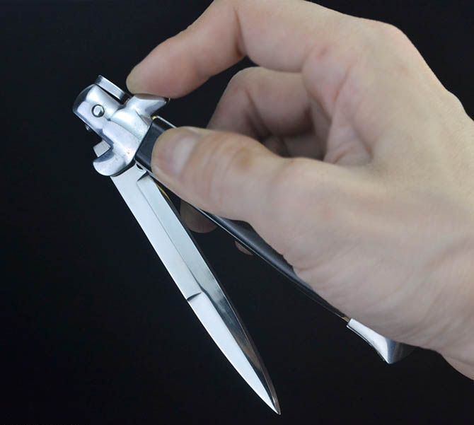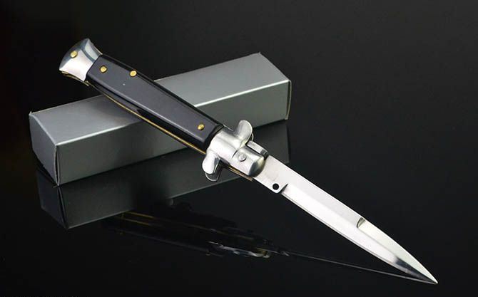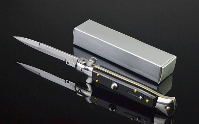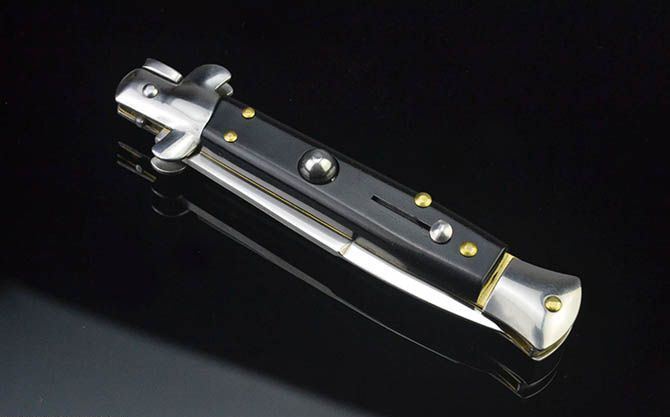 意大利黑手党经典侧跳黑柄普通版 全 长:22.0cm 刃 长:8.0cm 柄 长:12.5cm 刃 宽:1.2cm(最宽处) 刃 厚:3.0mm 刃 材:440 硬 度:55HRC 刀 柄:树脂柄片 表 面:镜光 开刀方式:自动横出 重 量:120.0克