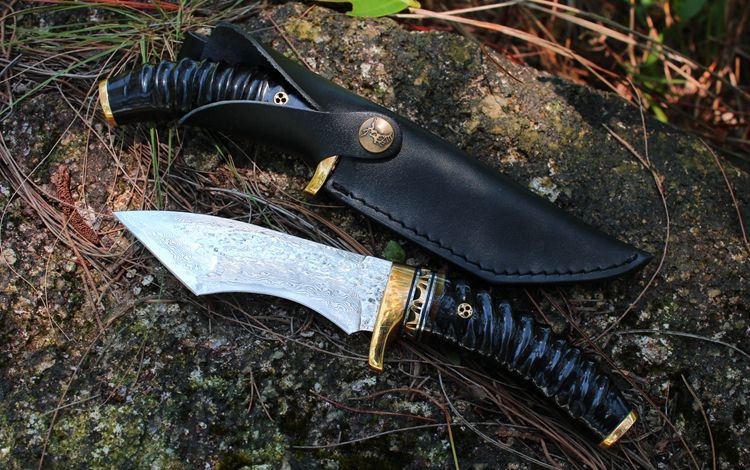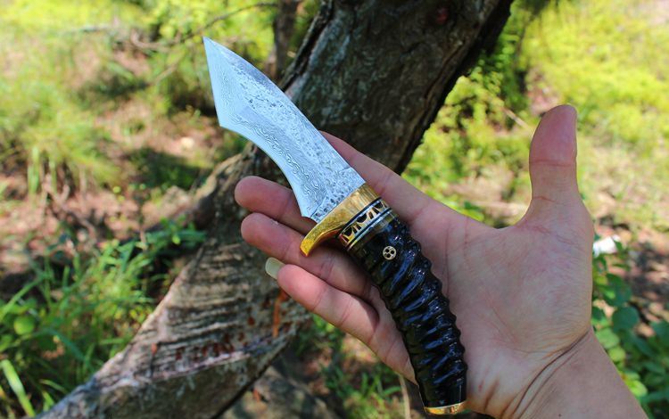 刃材:大马士革钢 全长:23.5cm 刃长:12cm 柄长:11.5cm 刀刃钢材厚度:4mm 硬度:59-60HRC 柄材:黄铜护手+黄铜镂空+花牛角片隔层+原只黄 羊角、非常高档 另配黑牛皮套、刀刃极其锋利、过水瓶+刮胡子削纸轻松搞定