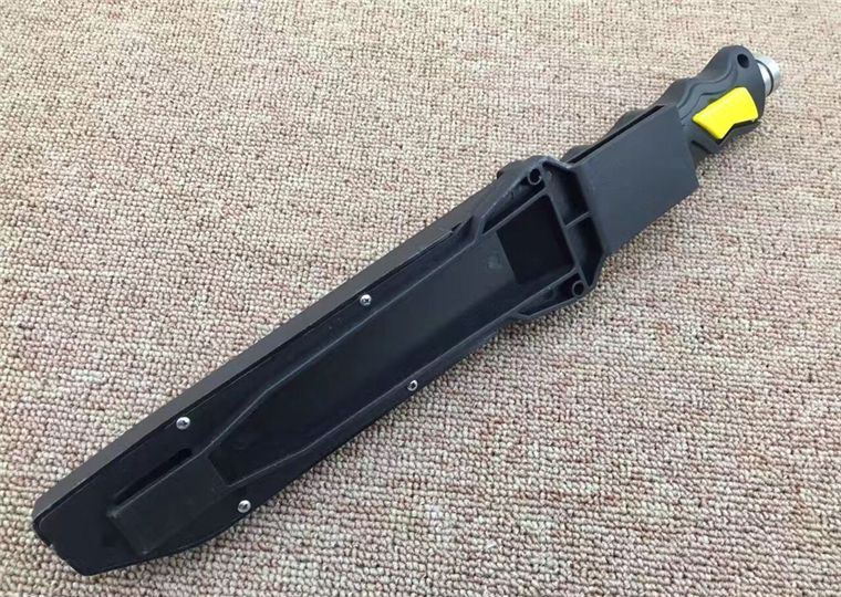 大号黄色军用潜水刀双锋全刃 全 长:34CM 刃 长:20CM 柄 长:14CM 刃 宽:2.9(最宽处) 刃 厚:0.3 刃 材:440C 硬 度:58HRC 刀 柄:橡胶 刀 鞘:ABS工程塑料 表 面:砂光 结 构:一体直通刀柄,结构牢固 净 重:400克(含刀套)