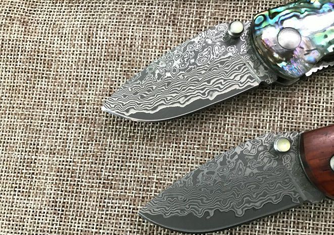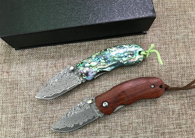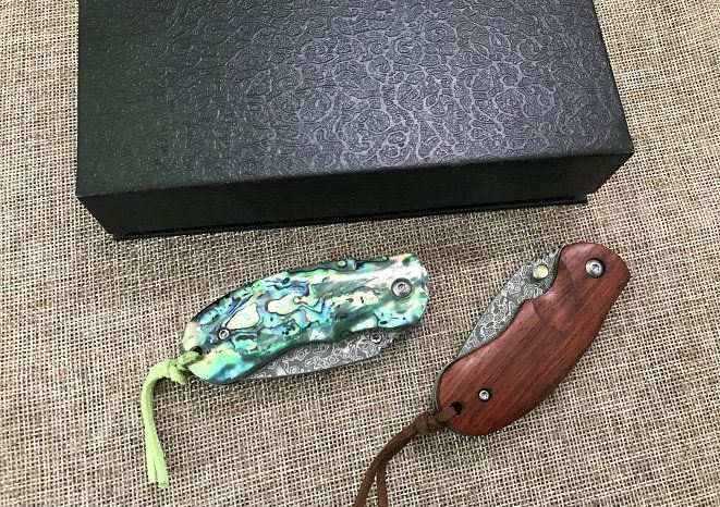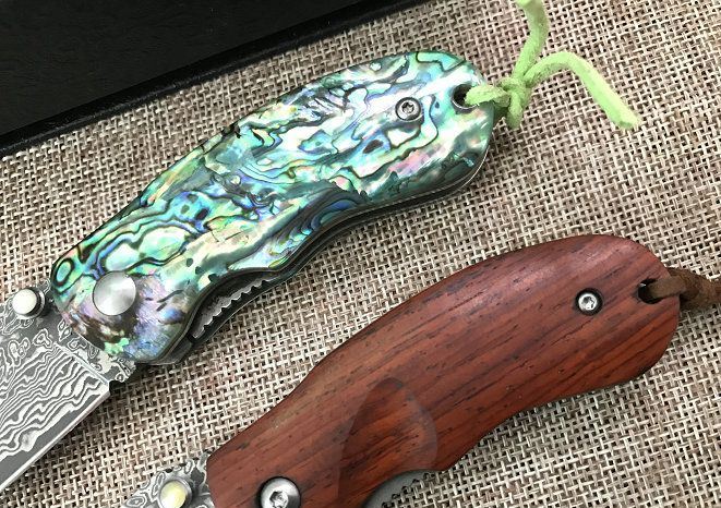 大马士革兰鹰折刀 全长:13cm 刃长:5cm 柄长:8cm 刃厚:2.5mm 钢材:大马士革钢 天然贝壳,科檀木手柄,开刀手钉都是天然真贝壳