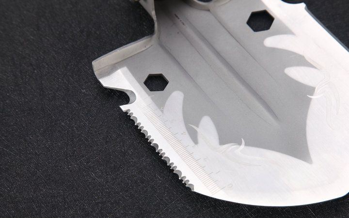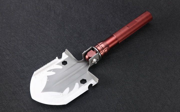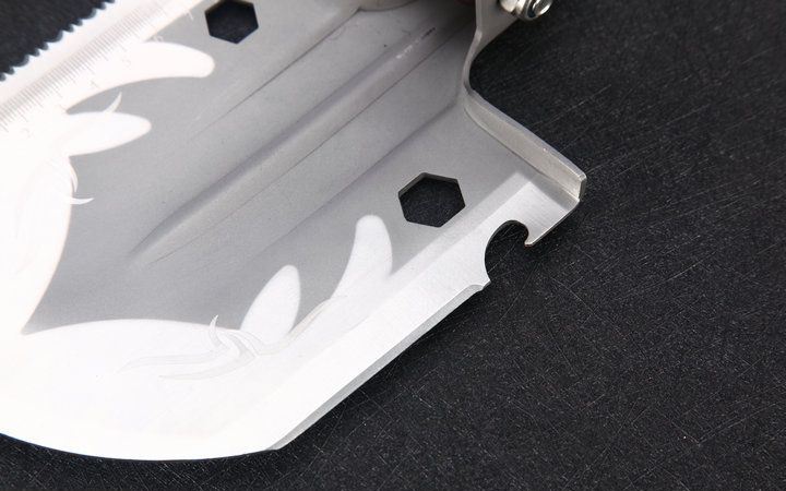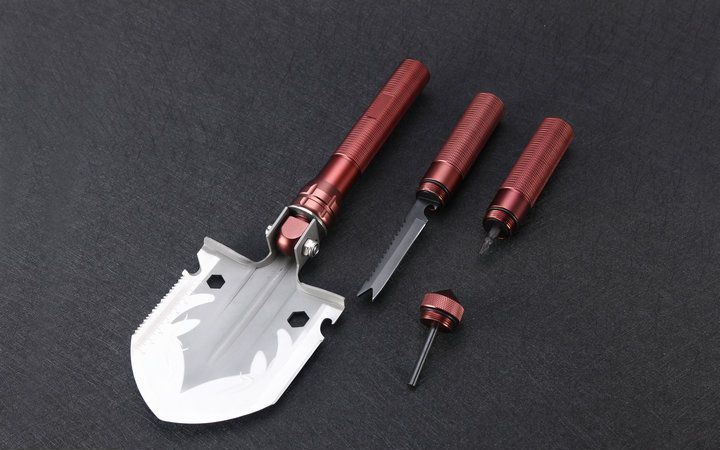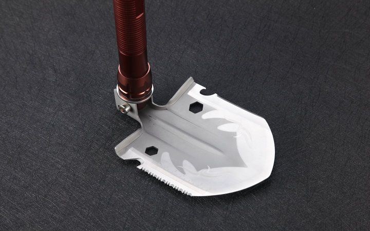 伸展长度:58.5cm 折叠长度:43.7cm 锹面尺寸:14.5*12.5cm 刀刃长度:6.5cm 厚度:2.1mm 重量:950约g (含包装物) 刃材:进口不锈钢 柄材:加厚航空铝材+啡色 包装:迷彩牛津布袋子,可挂腰上 特点:手柄拉分开三折,方便外出,安装简便 功能:有铲,锄 ,锯,刀,开瓶器,打火棒,撞击器,一字十字螺批等功能,在生产工艺上采用上好淬火高碳钢,增加强度,抗磨损,抗腐蚀,耐高温等优势.有把铲在手,登山,外出永不怕