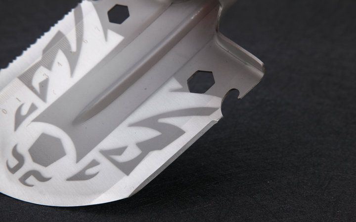 伸展长度:58.5cm 折叠长度:43.7cm 锹面尺寸:14.5*12.5cm 刀刃长度:6.5cm 厚度:2.1mm 重量:1100约g (含包装物) 刃材:进口不锈钢 柄材:加厚航空铝材+啡色 包装:迷彩牛津布袋子,可挂腰上 特点:手柄拉分开三折,方便外出,安装简便 功能:有铲,锄 ,锯,刀,开瓶器,打火棒,撞击器,一字十字螺批等功能,在生产工艺上采用上好淬火高碳钢,增加强度,抗磨损,抗腐蚀,耐高温等优势.有把铲在手,登山,外出永不怕