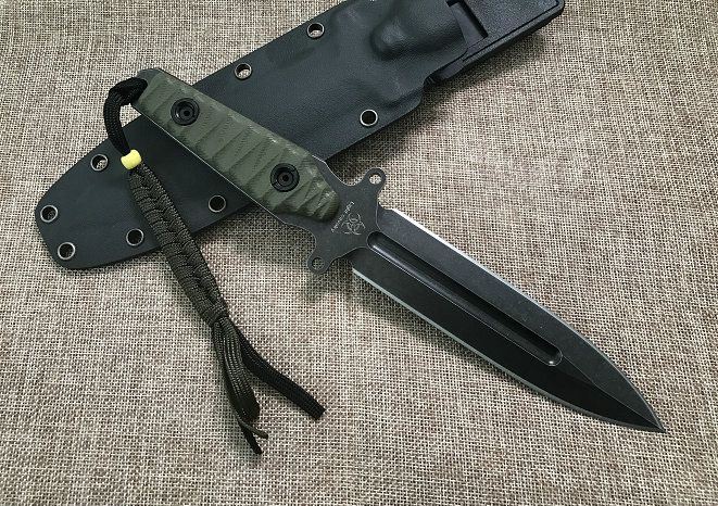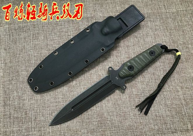 新版百炼轻骑兵双刃刀 全长: 260MM 刃长: 130MM 刃厚: 5MM 刃材: D2 手柄: G10手柄 硬度: 59-60HRC 刀鞘: K鞘 热处理:真空+深冷处理 主要性能:切,割,削,刺为主,超凡耐磨性保持性 表面处理:怀旧亚光处理(沧桑石洗)