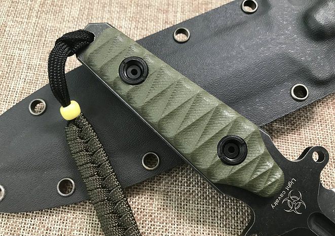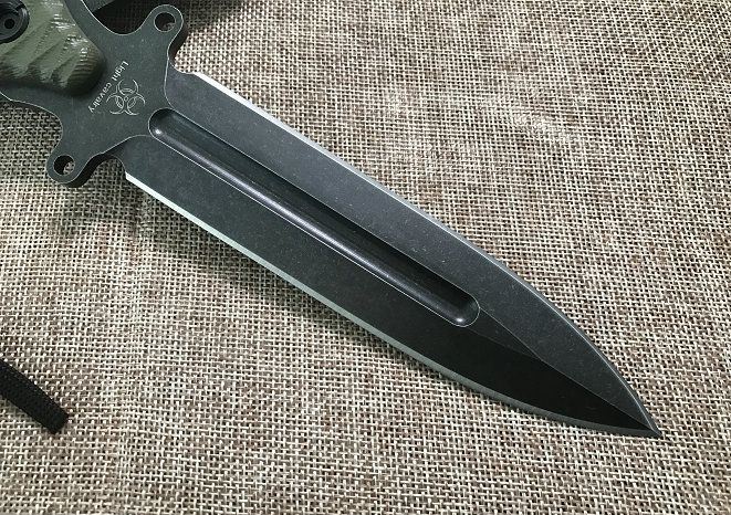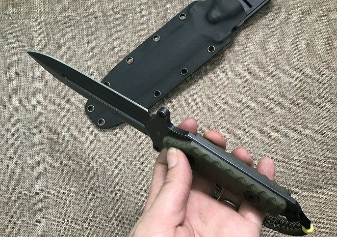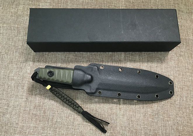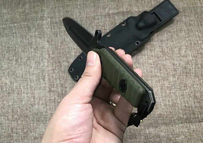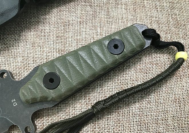 全长: 260MM 刃长: 130MM 刃厚: 5MM 刃材: D2 手柄: G10手柄 硬度: 59-60HRC 刀鞘: K鞘 热处理:真空+深冷处理 主要性能:切,割,削,刺为主,超凡耐磨性保持性 表面处理:怀旧亚光处理(沧桑石洗)