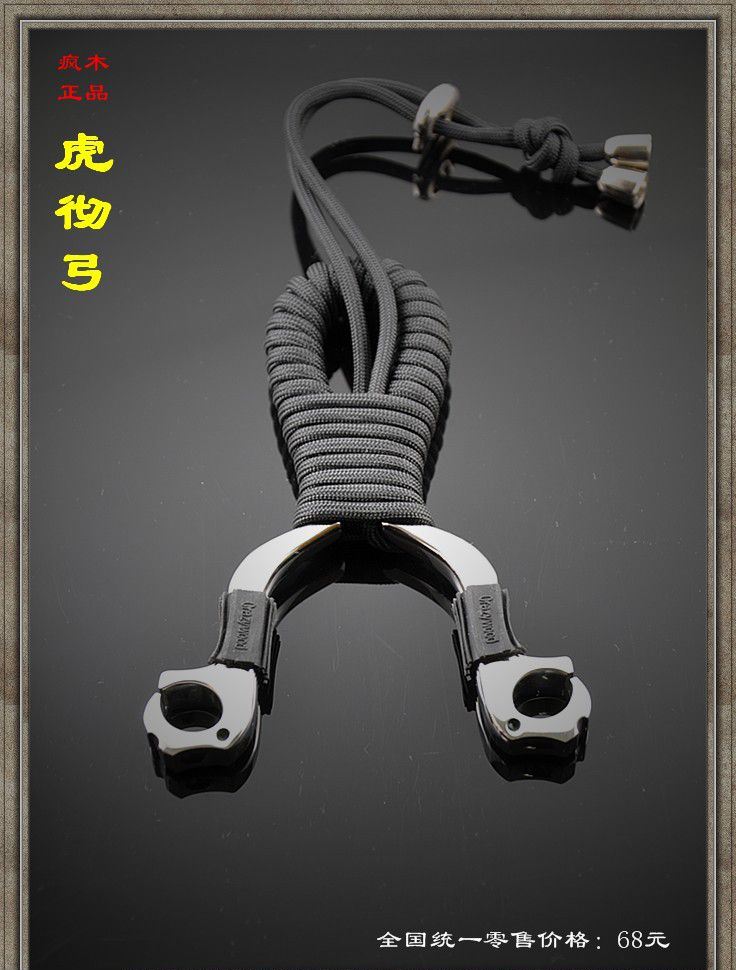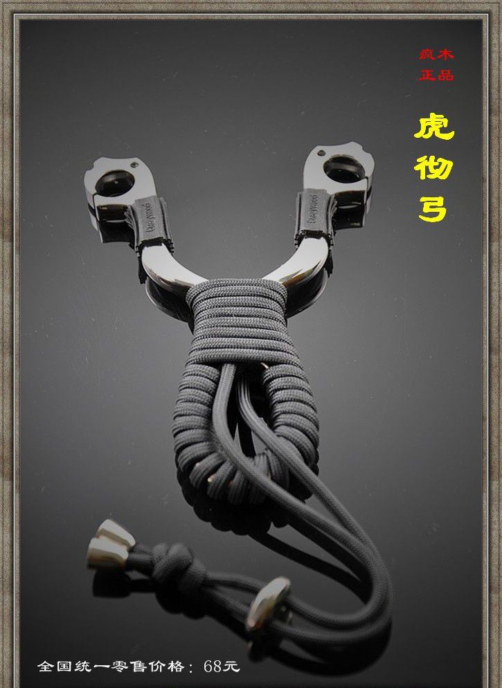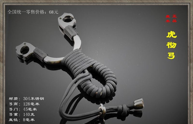 疯狂木头_虎澈弓 弓高:125mm 弓门:45mm 净重:125克(裸弓重量) 材质:304不锈钢 开口:1.2mm(精密线切割) 配件:正品虎彻弓一把(成品弓高品质伞绳绕制弓柄,配有弓门防滑套,合金绳松,伞绳封扣金属吊坠),专业超高速弹弓皮筋一副。 造型中规中矩的传统弹弓,真正的304不锈钢精品好弓,从伞绳用料,吊坠,外观打磨等细节就可以看出正品弹弓的精细之处。