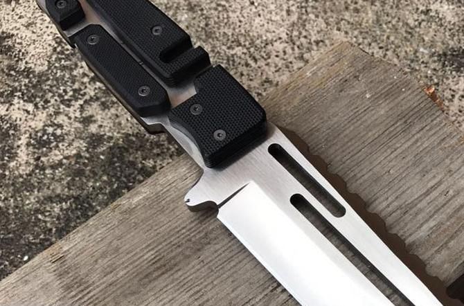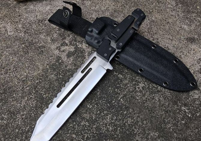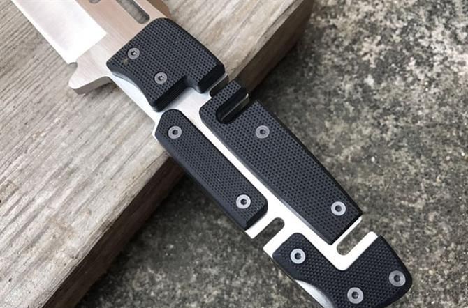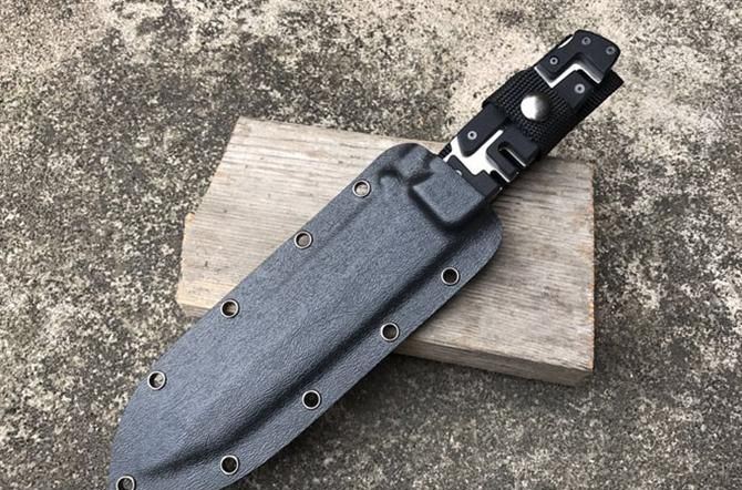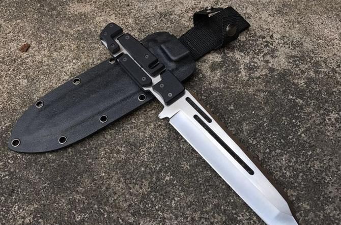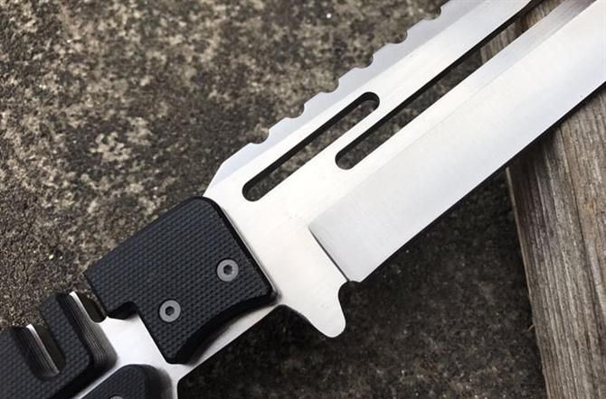 马赛克型拉丝直刀 全 长:290mm 刃 长:165mm 柄 长:120mm 刃 宽:40mm 刃 厚:5mm 刃 材:7Cr17Mov 重 量:700g(含包装) 硬 度:59HRC 表 面:拉丝 柄 材:钢一体柄+G10条 锁 型:定锁 其 他:配K鞘