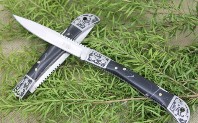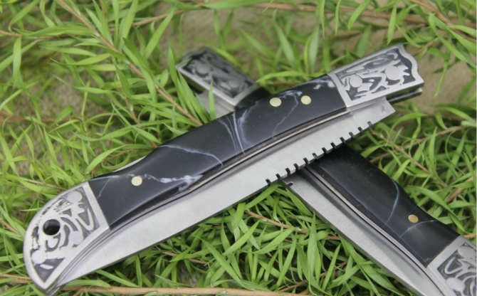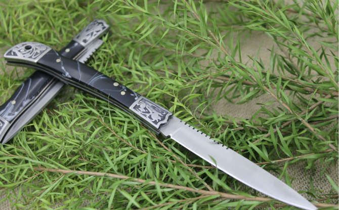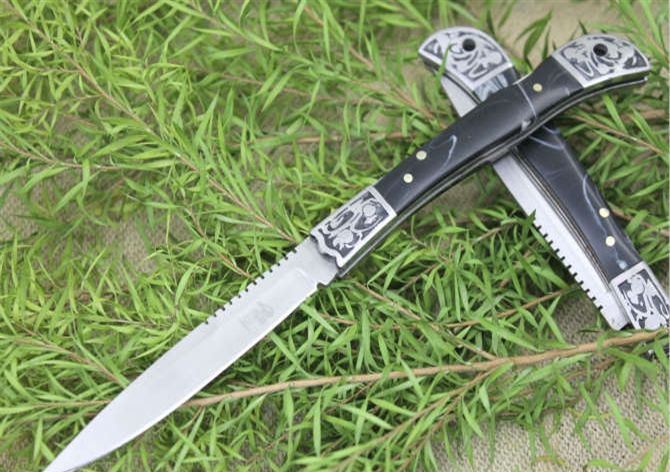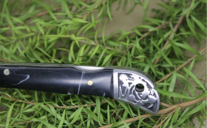 袖珍迷你大拇指小折刀大号 全长:19cm 刃长:7.5cm 柄长:9.5cm 刃厚:0.18cm 刃宽:1.3cm 刃材:3CR13MOV 柄材:铝合金图案+树脂柄片手柄 硬度:56HRC 净重:80克 锁定:背锁 表面处:砂光