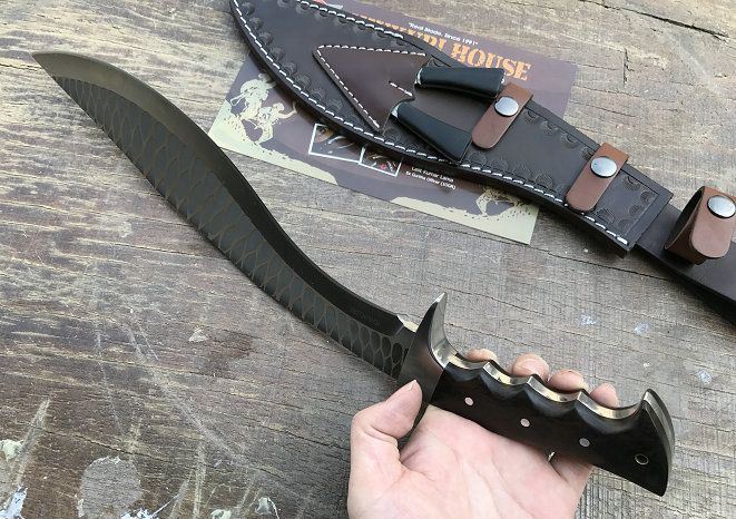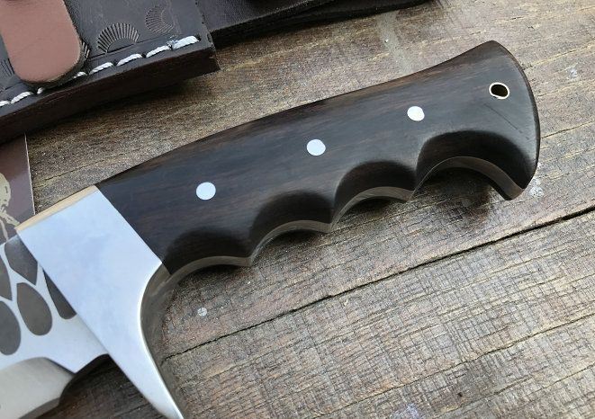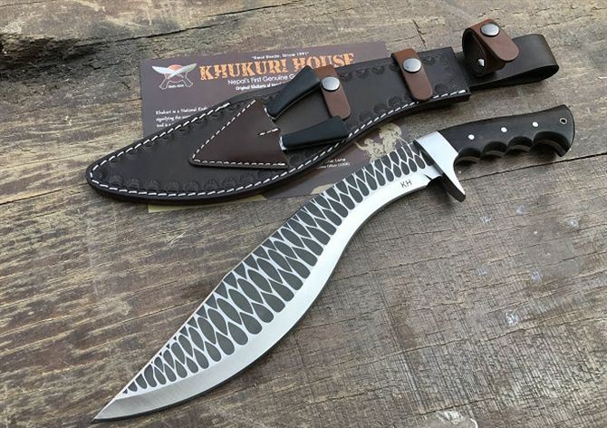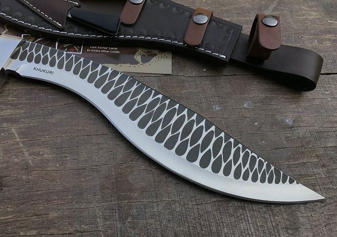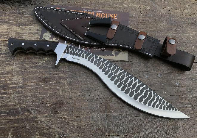 新版手工廓尔喀天之骄子狗腿刀 全长:43cm 刃长:30.5cm 柄长:11cm 厚度:6.0mm 硬度:60+- 钢材:9CR18MOV (锻打) 柄材:黑檀木 表面:锻打凹凸纹(一体龙骨) 重量:598g 总重:1000克 刀鞘:手工雕花牛皮刀鞘 廓尔喀刀(又称尼泊尔军刀)此刀全手工制作一体龙骨,不要拿普通的弯刀来对比(老鼠尾手柄)不是一个档次的,我们秉承“高质优品”之宗旨,在选料时不惜成本,制作时精益求精,每一把都精品