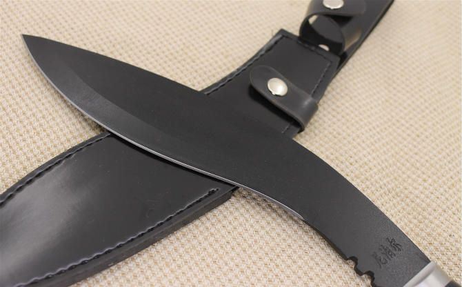 大号小狗飞刀黒版37CM 全 长: 37.5cm 刃 长: 20cm 重 量: 480克 刃 厚: 4mm 刃 材: 440 硬 度: 58HRC 表 面: 发黑色 柄 材: ABS 刀 鞘: 仿皮
