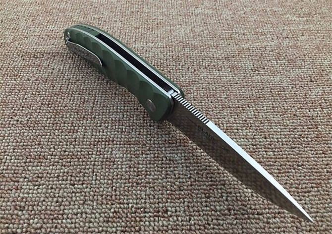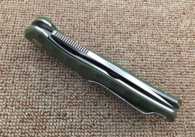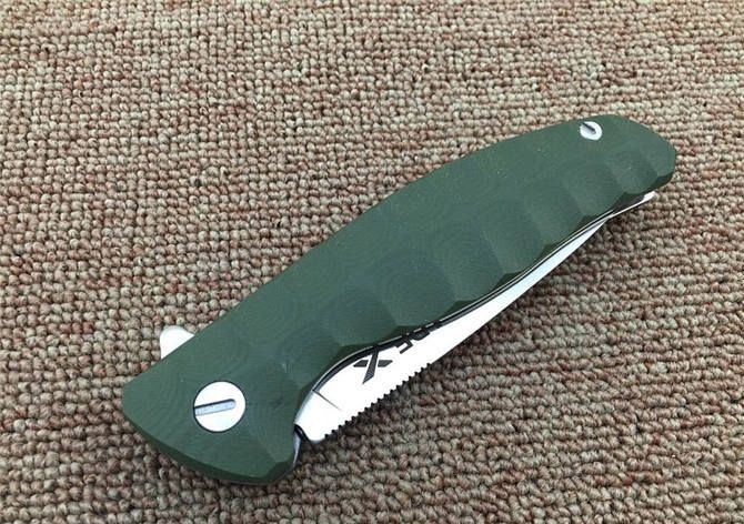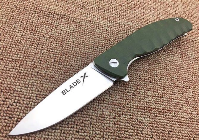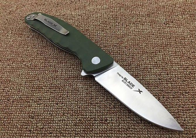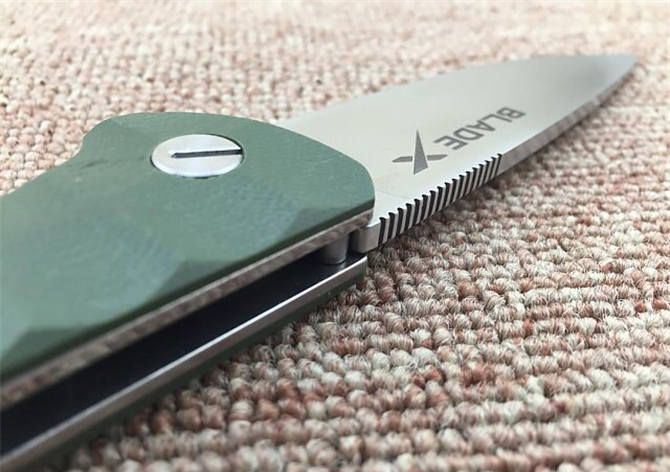 绿柄Blade X自品牌系列轴承EDC折刀 全 长:22.3cm 刃 长:9.8cm 柄 长:12.8cm 刃 宽:3cm 刃 厚:4mm 刃 材:8CR13MOV 重 量:183g 硬 度:59HRC 真空热处理 刀片表面处理:刀片数控加工,表面拉丝效果,增加质感 柄 材:绿色G10 ,防滑防脱手 锁 型:2.0安全锁片 工 艺:部件cnc数控加工 擅长工作: EDC,切削