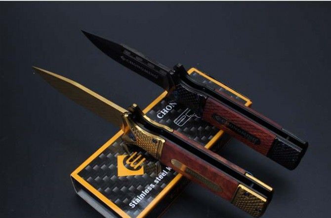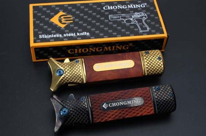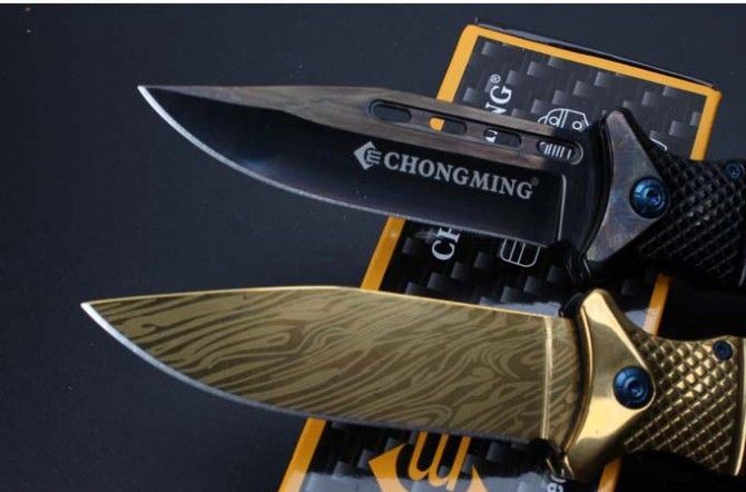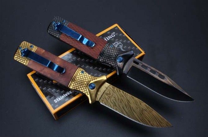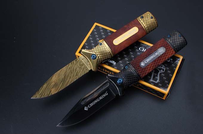 勃朗宁CM73快开折刀 全 长:213mm 刃 长:95mm 柄 长:118mm 刃 宽:25mm 刃 厚:3.3mm 刃 材:5Cr15Mov 重 量:224g(含包装) 硬 度:57HRC 颜 色:金色、黑色 表 面:镀钛 柄 材:双雕花钢头+红影木 另一款酸枝木 锁 型:快开 其 他:配彩盒