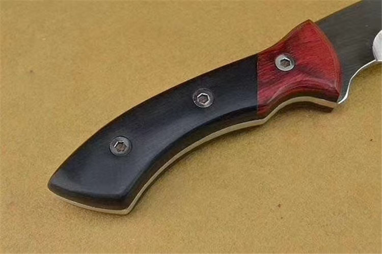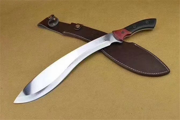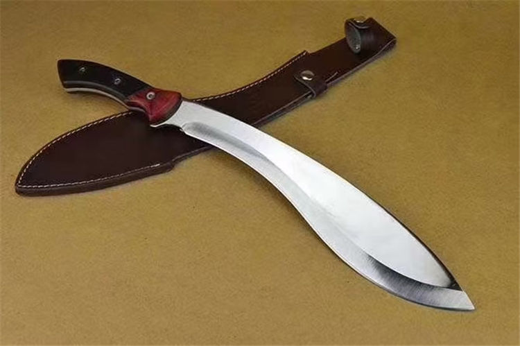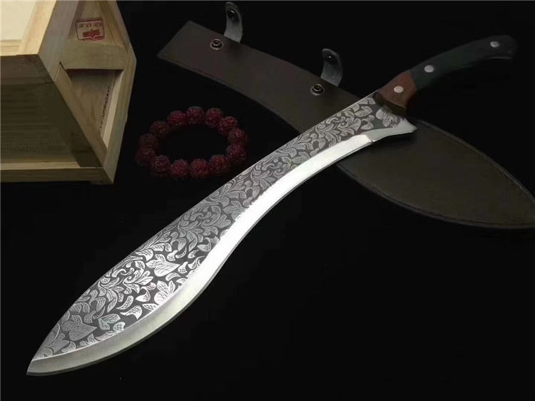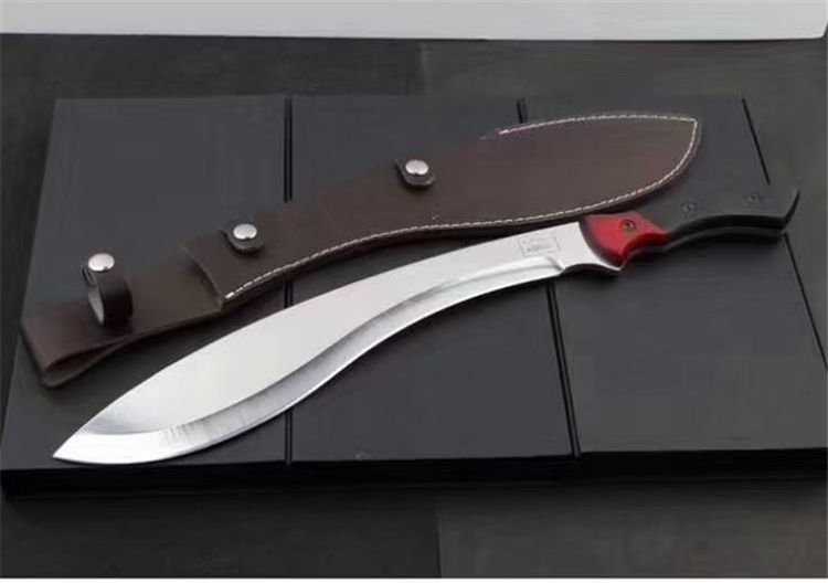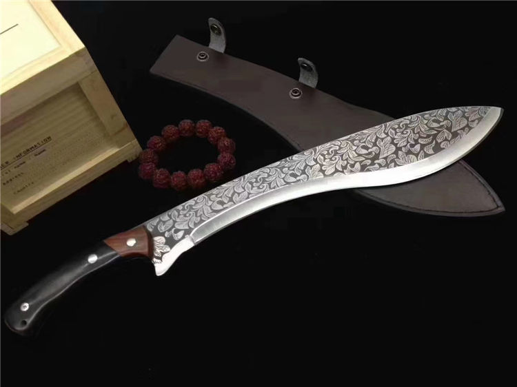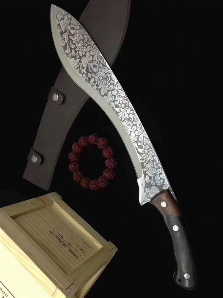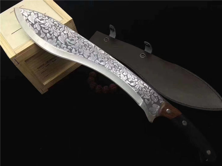 新版刀奴菊花弯刀 全 长:51cm 刃 长:37cm 柄 长:14cm 刃 厚:5.2mm 刃 宽:6.8cm 刃 材:5Cr15Wov 表 面:酸蚀菊花纹 柄 材:彩木拼黒木 硬 度:58HRC 净 重:109克(含皮套) 包 装:真皮鞘、纸盒