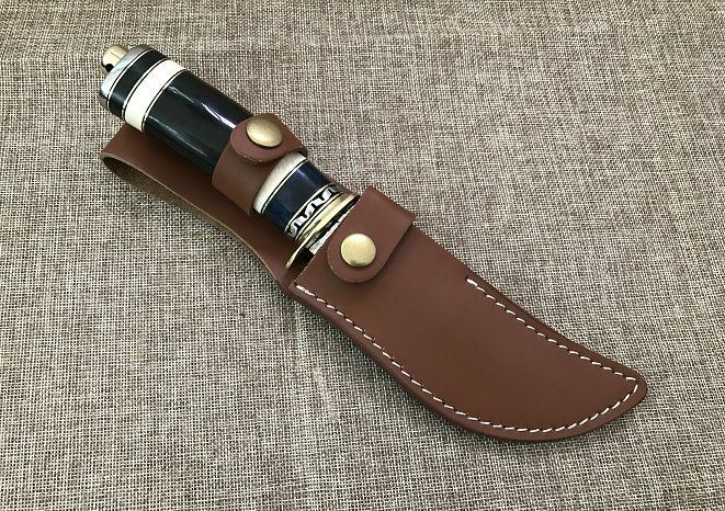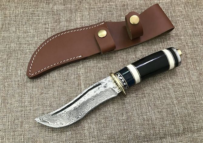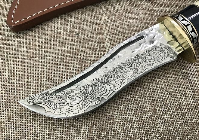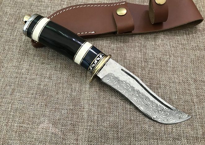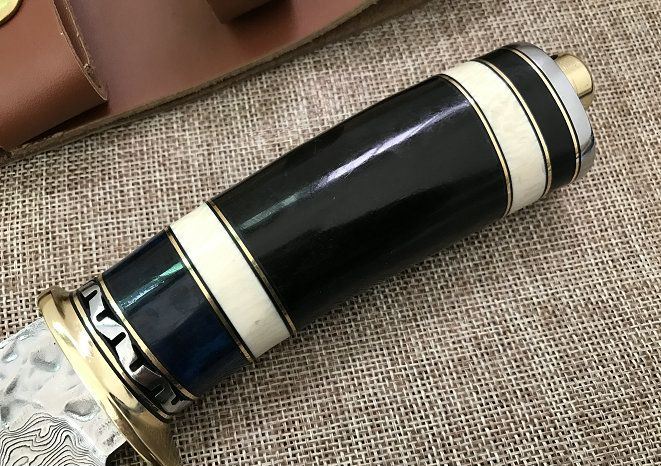 分解者大马士革收藏刀 全长:24cm 刃长:12cm 刃厚:4.2mm 手柄用料:黄铜护手+牛骨+白骨+天然黑牛角+白钢 硬度:59-60HRC 配真牛皮刀套、礼盒包装 新品上市,大马士革-分解者收藏刀,极致手工、资深刀匠打造、才用无芯进口大马士革钢刀刃、花纹饱满清晰可见