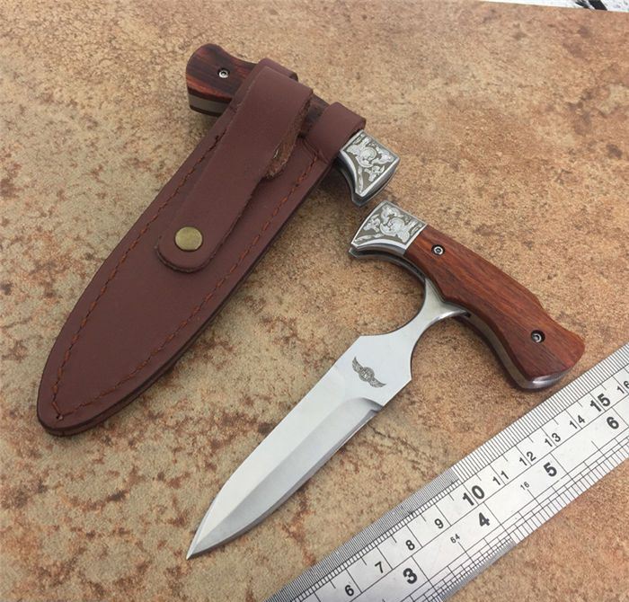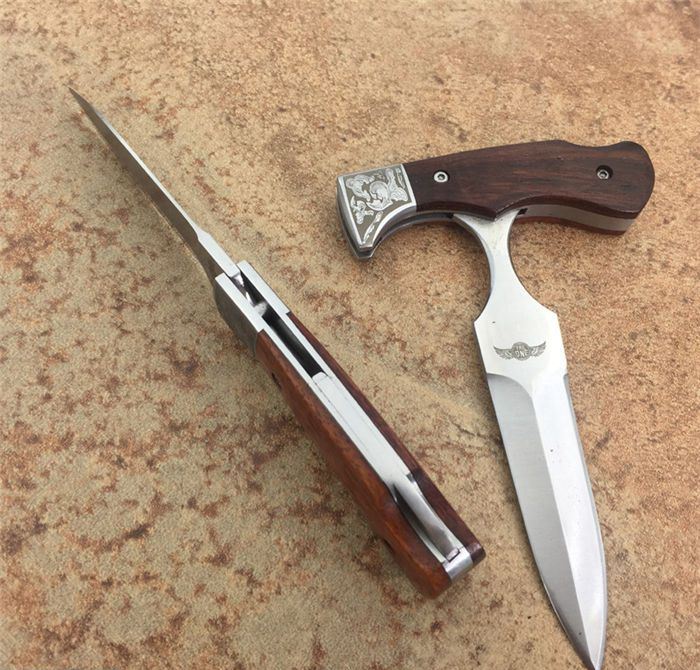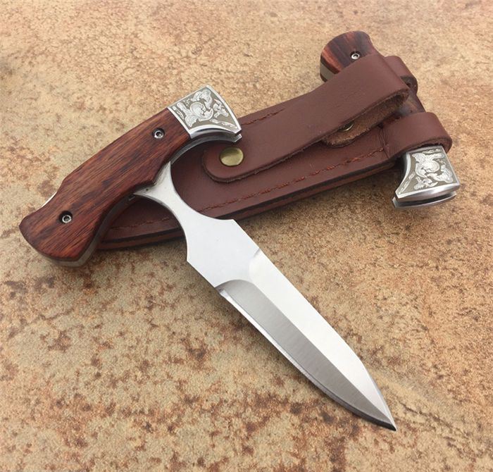 新款欧花Theone变形手刺酸枝木柄 全长:15.2CM 刃长:7.5CM 刃厚:0.3CM 刃材:5铬15不锈钢 柄材:酸枝木+钢架 重量:75克 Theone变形手刺,设计精美巧妙,手柄采用钢架铆红酸枝木,集小直刀,手刺两用功能,双位锁定精确,实用性超强,配送小皮鞘,非常适合贴身护卫和收藏