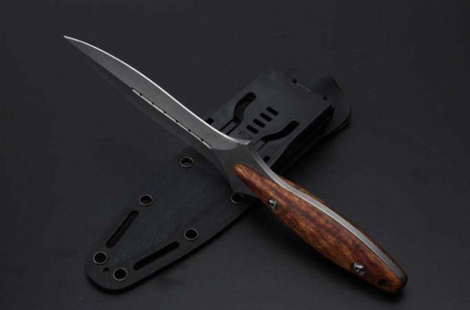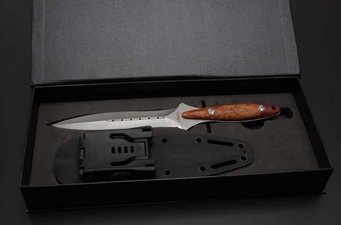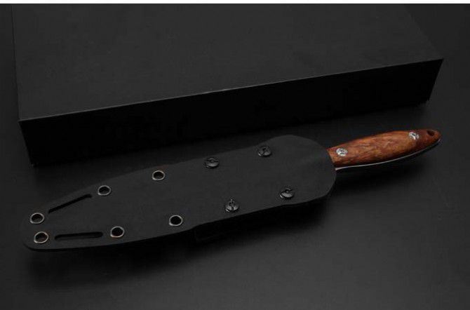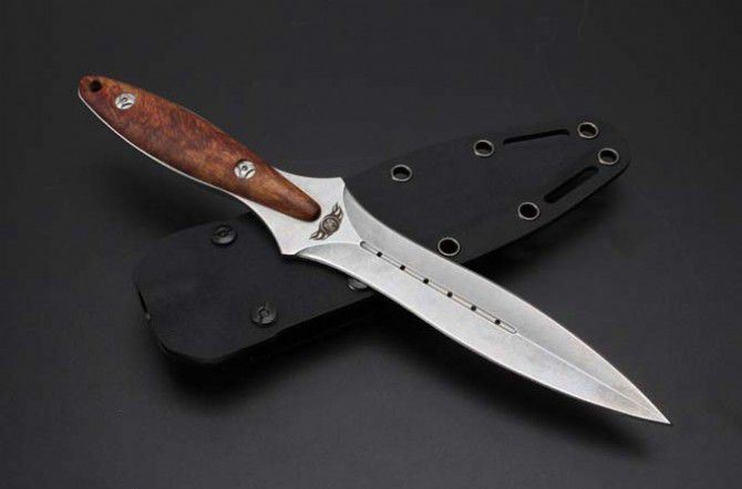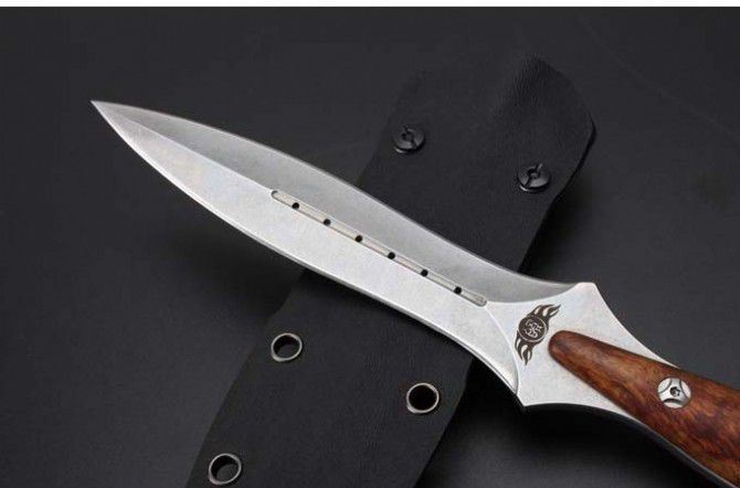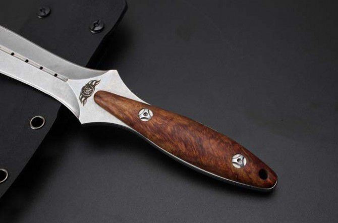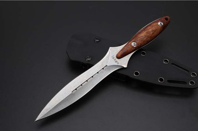 圣棱双刃直刀 全长: 26mm 刃长: 14.7mm 柄长: 11.3mm 刃材: 440c 柄材: 非洲檀香 表面处理: 石洗 水磨: 凹磨 配置: k鞘,高端礼盒