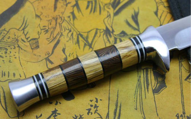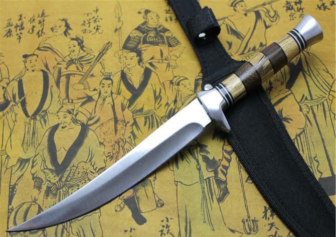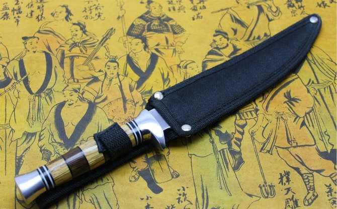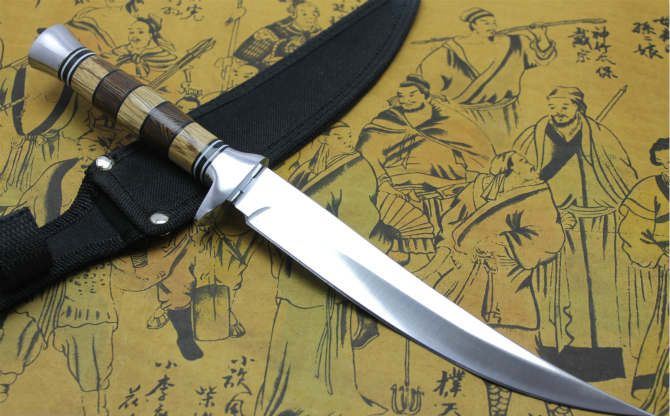 竹叶尖刀2号斑马柄 全 长:30cm 刃 长:17.0cm 柄 长:11.5cm 刃 宽:2.2cm(最宽处) 刃 厚:2.5mm 刃 材:420 硬 度:56HRC 刀 柄:双钢头+斑马柄 表 面:镜光 毛 重:120克 备 注:带尼龙刀套