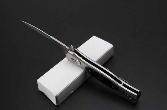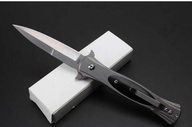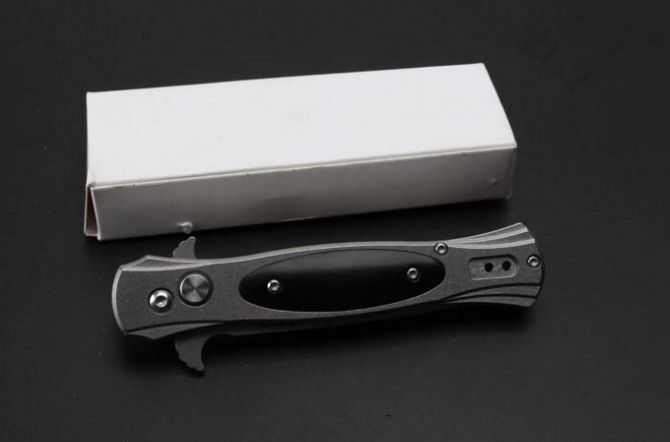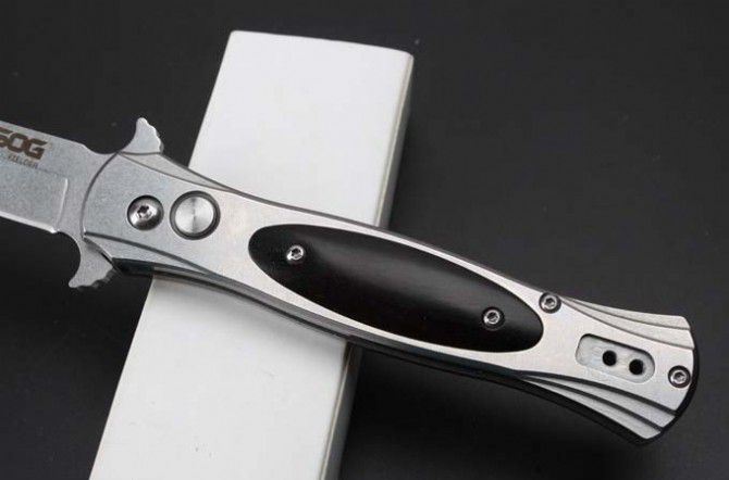 SOG制锁弹跳刀 全 长:207mm 刃 长:87mm 柄 长:120mm 刃 宽:18.5mm 刃 厚:3.0mm 刃 材:8Cr14Mov 重 量:248g(含包装) 硬 度:58-60HRC 表 面:石洗 柄 材:钢+黑檀木 锁 型:制锁 其 他:配白纸盒
