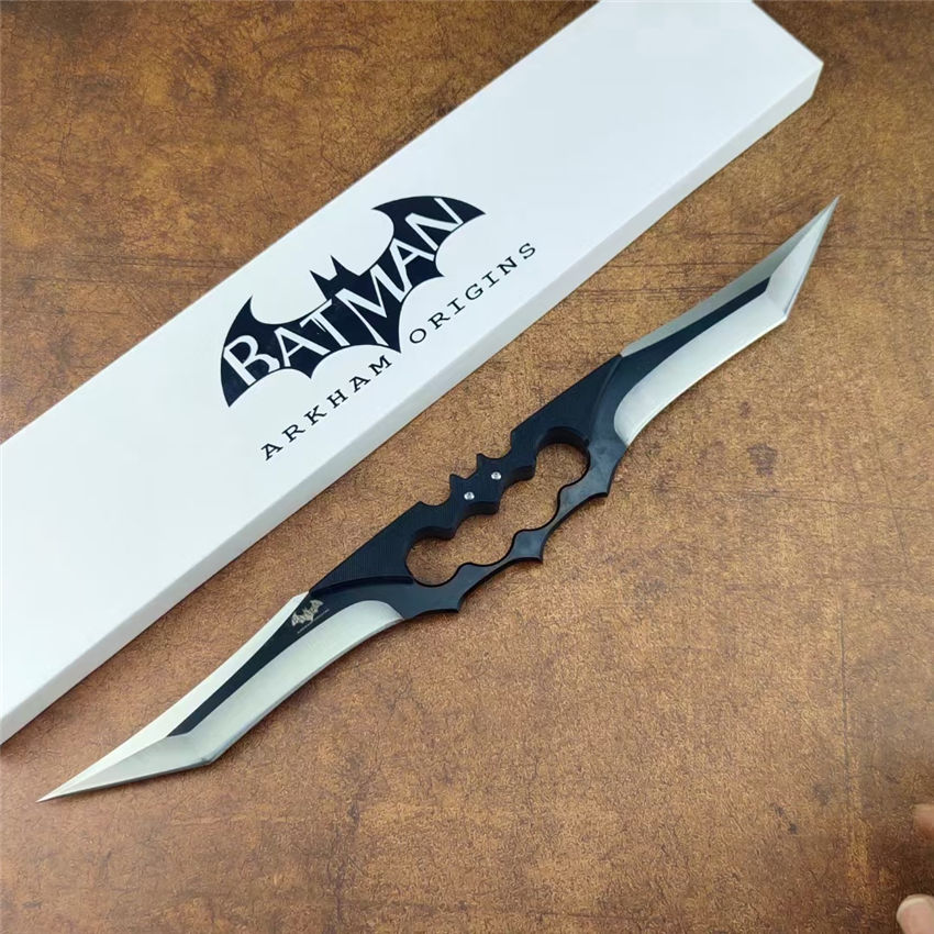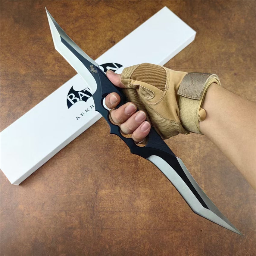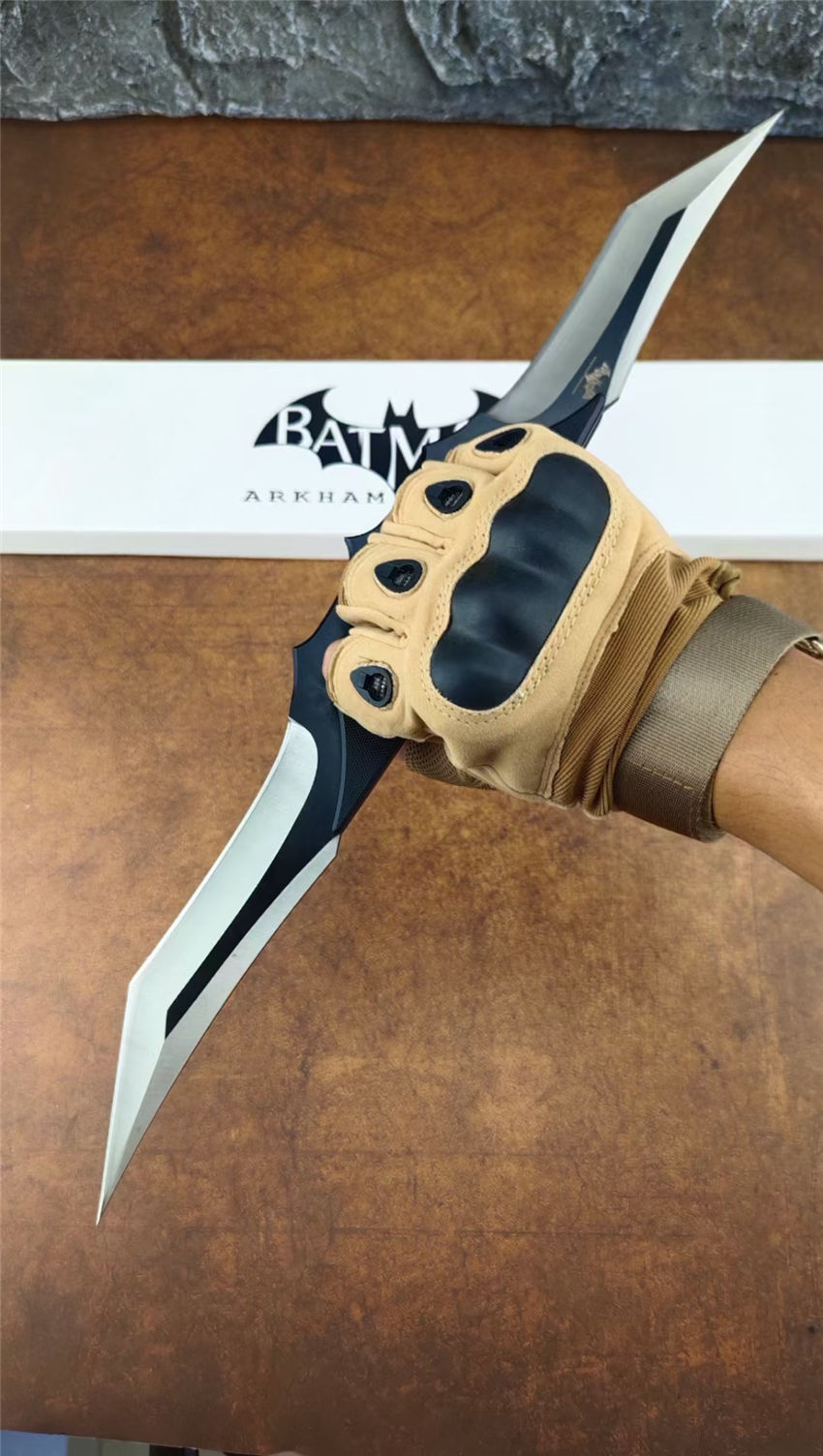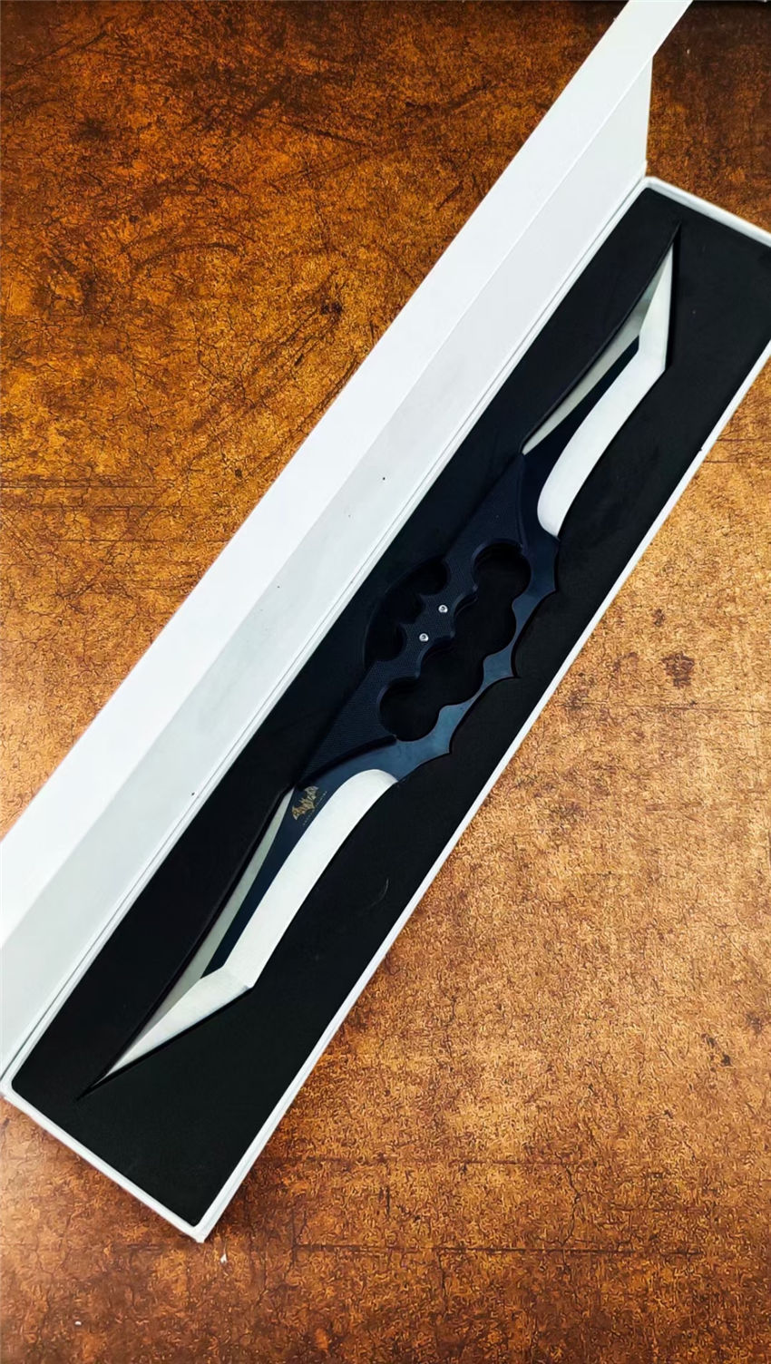 蝙蝠直刀 全长:44.5cm 刃长:两边16cm 柄长:17cm 厚度:5.8mm 硬度:58HRC 钢材:7CR14MOV特种钢 柄材:G10+钢 表面:砂光+发黑 重量:436克,714克含包装盒 包装:高档硬盒+EVA