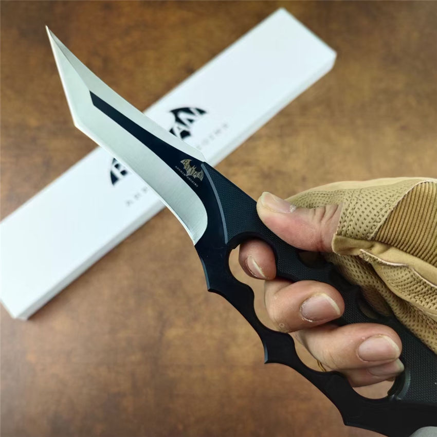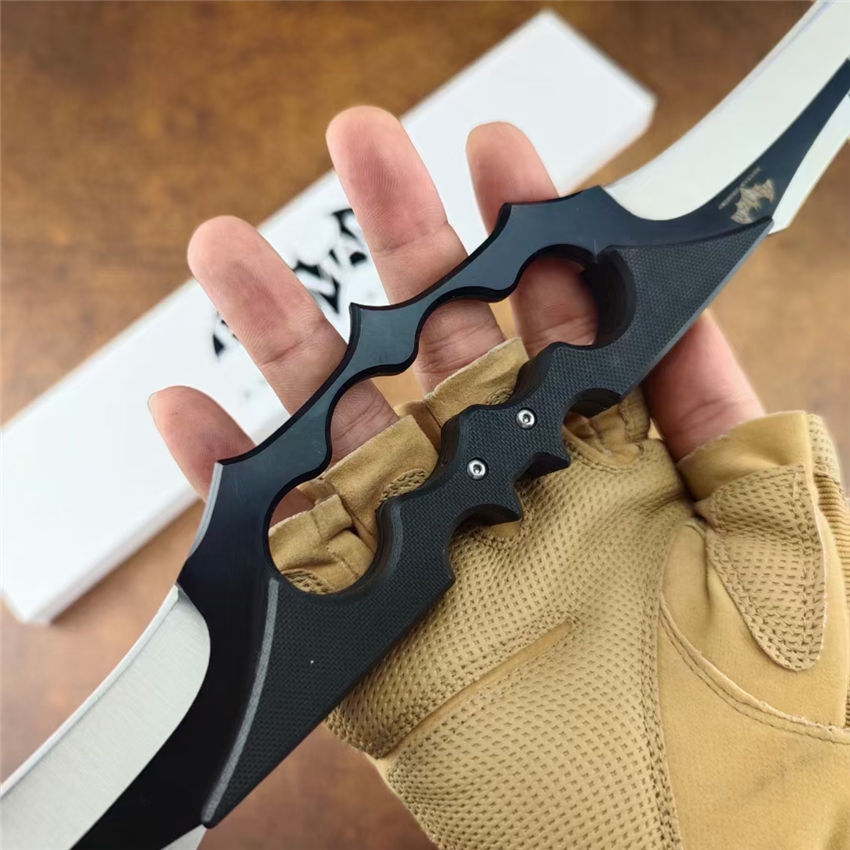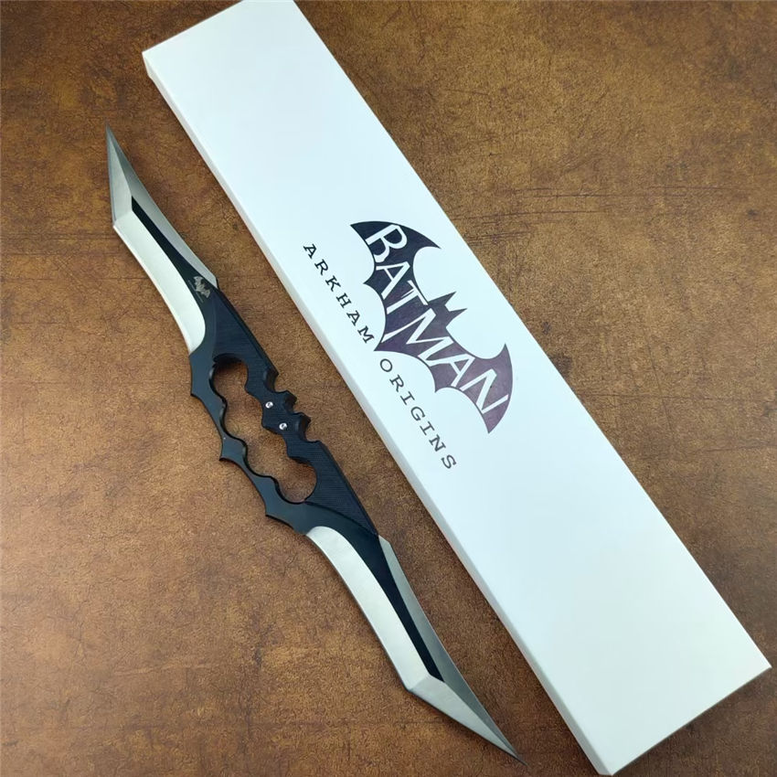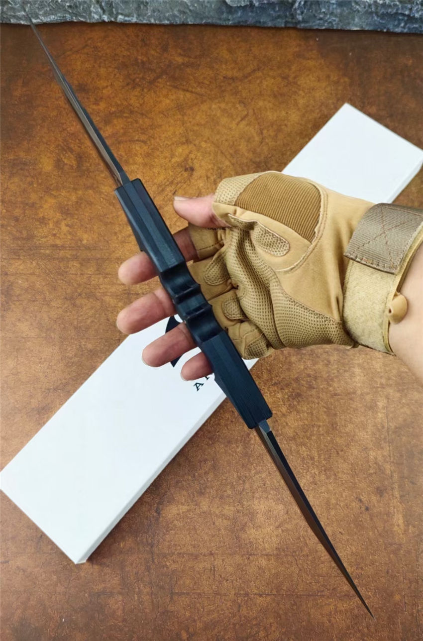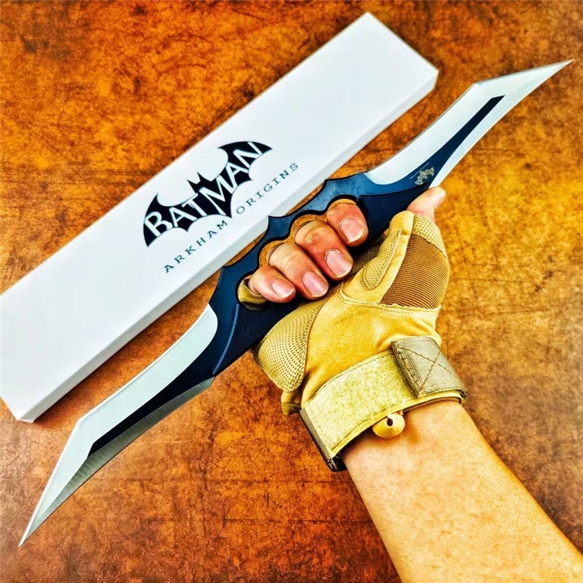 蝙蝠直刀 全长:44.5cm 刃长:两边16cm 柄长:17cm 厚度:5.8mm 硬度:58HRC 钢材:7CR14MOV特种钢 柄材:G10+钢 表面:砂光+发黑 重量:436克,714克含包装盒 包装:高档硬盒+EVA