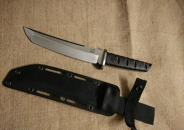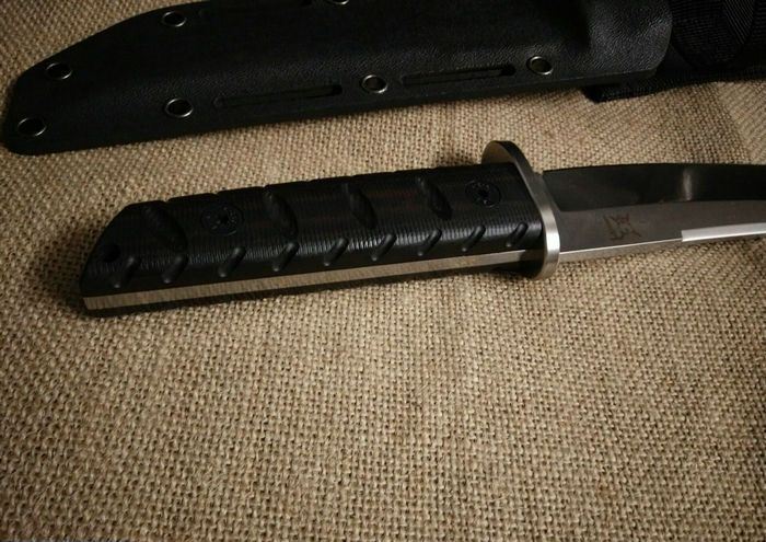 华匠坊冷月日式必杀刀 总长度:303mm 刃长:180mm 柄长:118mm(含护手长123mm) 厚度:5.2mm 柄厚:22.5mm 刃宽:35mm 刃材:DC53 ,真空热处理 柄材:G10,一体龙骨 硬度约60-61HRC 净重:350克,含K鞘重440克 配置战术K鞘