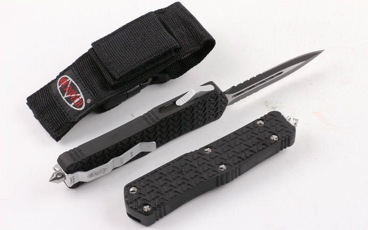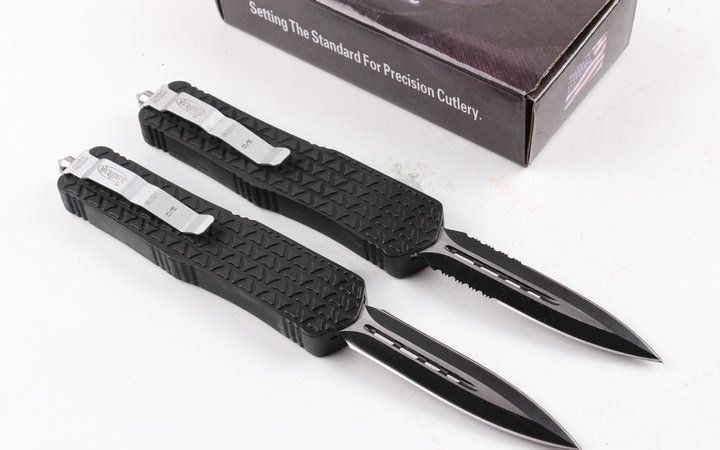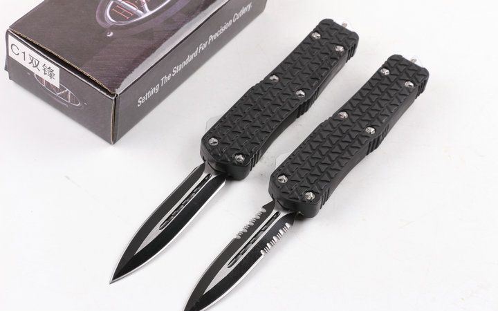 微技术伤齿龙C2直跳刀(双锋全刃/双锋半齿) 全 长: 23cm (含尾锥长度) 刃 长: 9cm 刃 宽: 2cm 刃 厚: 3mm 刃 材: 440 硬 度: 58HRC 刀净重:215克 总重量:300克(含包装物) 表 面: 黑钛 柄 材: 锌铝合金 刀 鞘: 尼龙 锁 闭: 弹簧直出 其 它:双锋和双锋半齿两款,下单注明。
