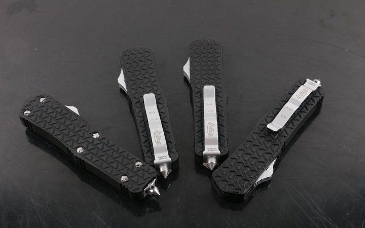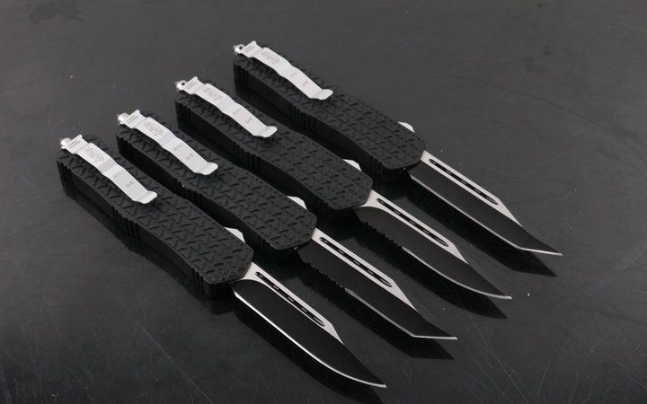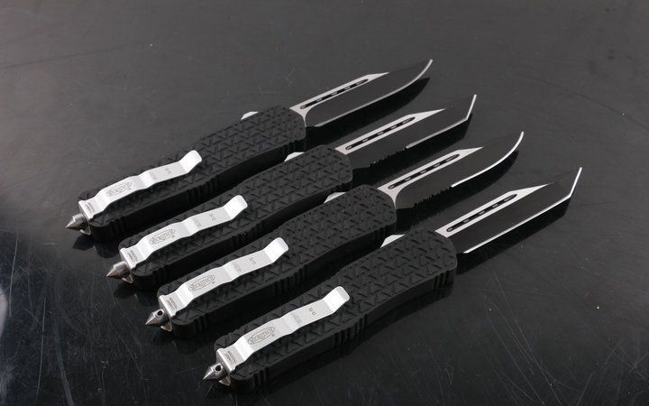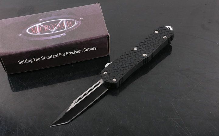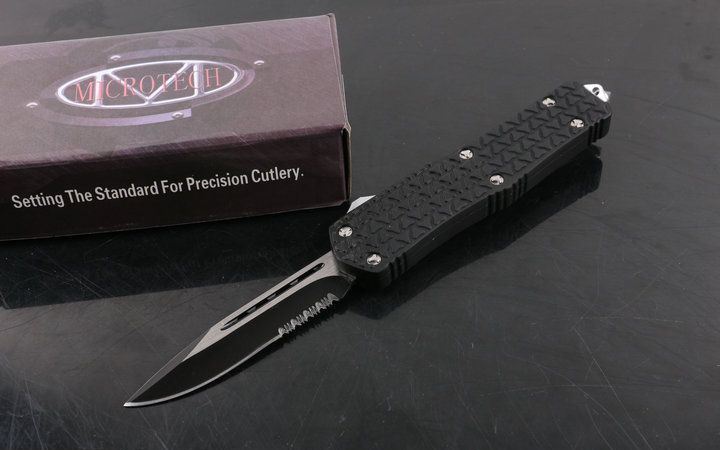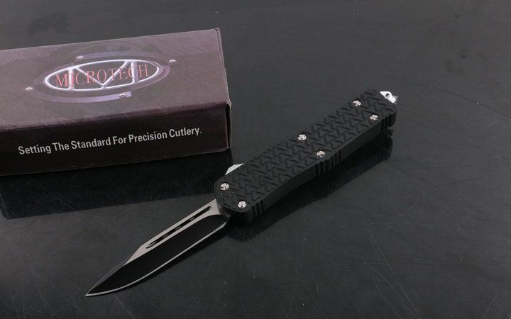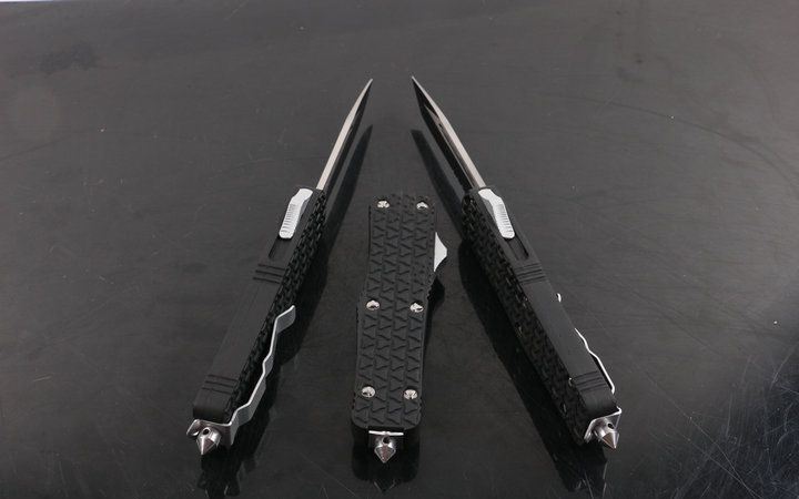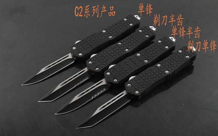 MICROTECH微技术伤齿龙C2黑色四款 全 长: 23cm (含尾锥长度) 刃 长: 9cm 刃 宽: 2cm 刃 厚: 3mm 刃 材: 440 硬 度: 58HRC 刀净重:215克 总重量:300克(含包装物) 表 面: 黑钛 柄 材: 锌铝合金 刀 鞘: 尼龙 锁 闭: 弹簧直出 其 它: 单锋黑柄