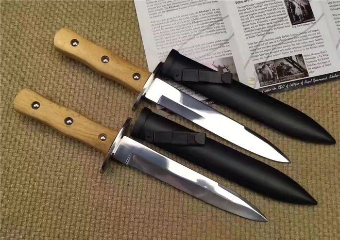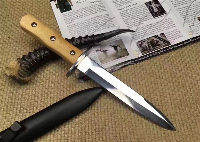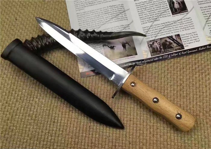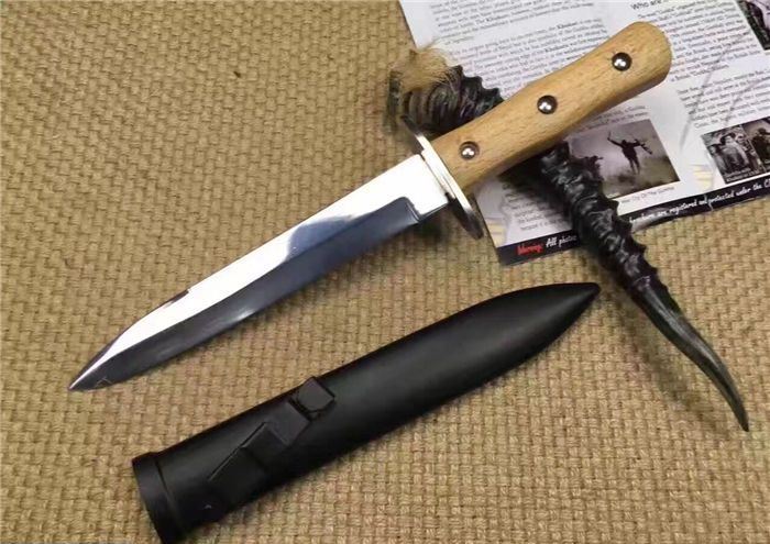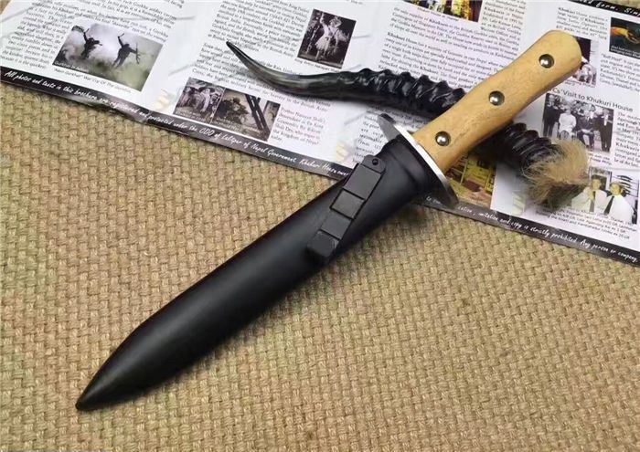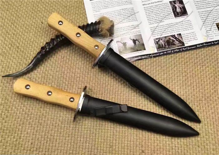 大号民兵刺刀 全长:30cm 刃长:18.5cm 柄长:12cm 刃宽:2.9cm 刃厚:0.3cm 刃材:420 硬度:56 表面:镜光 柄材:木柄 净重:230克 毛重:380克(含鞘) 刀鞘:钢鞘 铁鞘夹 可绑皮带上或绑腿
