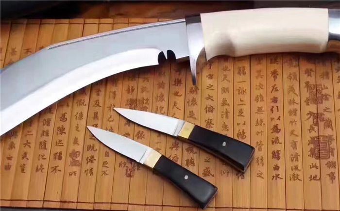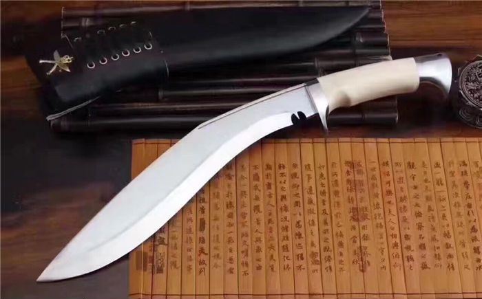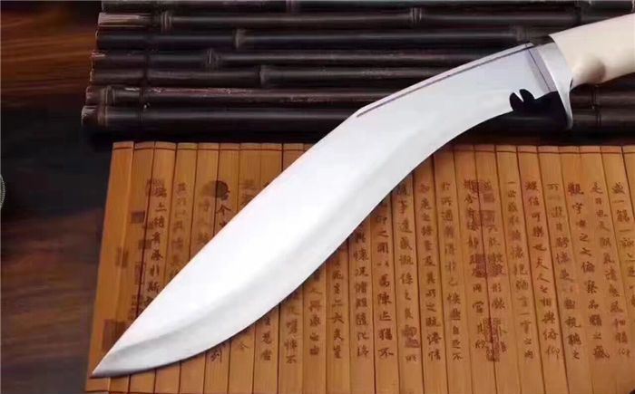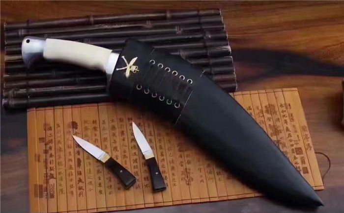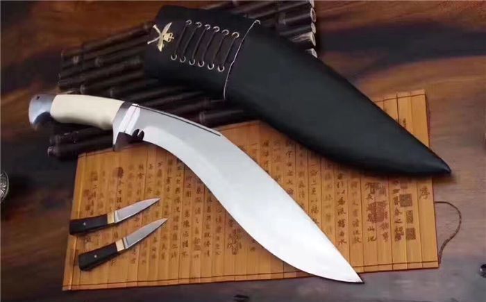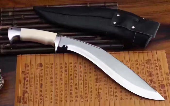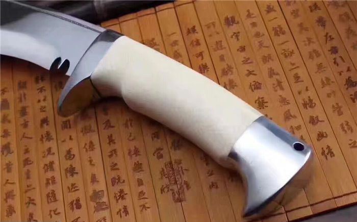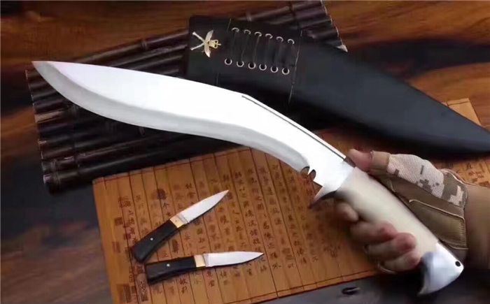 廓尔喀新血魔大弯刀 长度:43厘米左右 厚度:6.2厘米左右 前身宽度:5.2左右 硬度:59-61左右 刃材:进口汽车弹璜钢 柄材:双钢头+兽骨 配送:刀鞘一个,辅刀两把