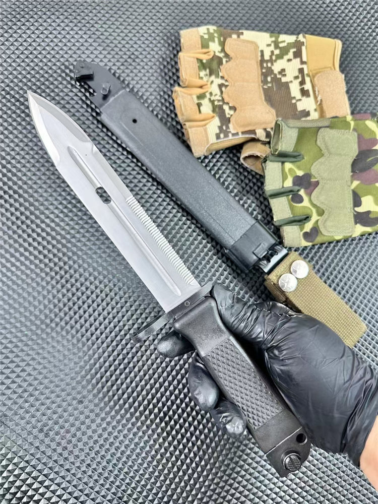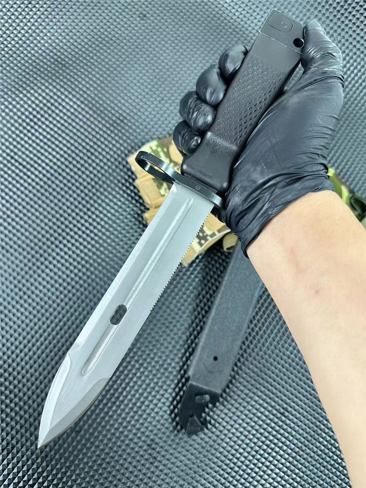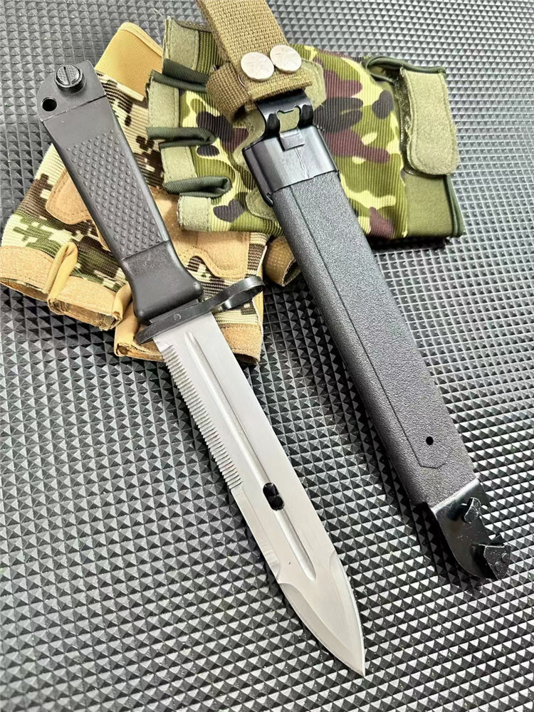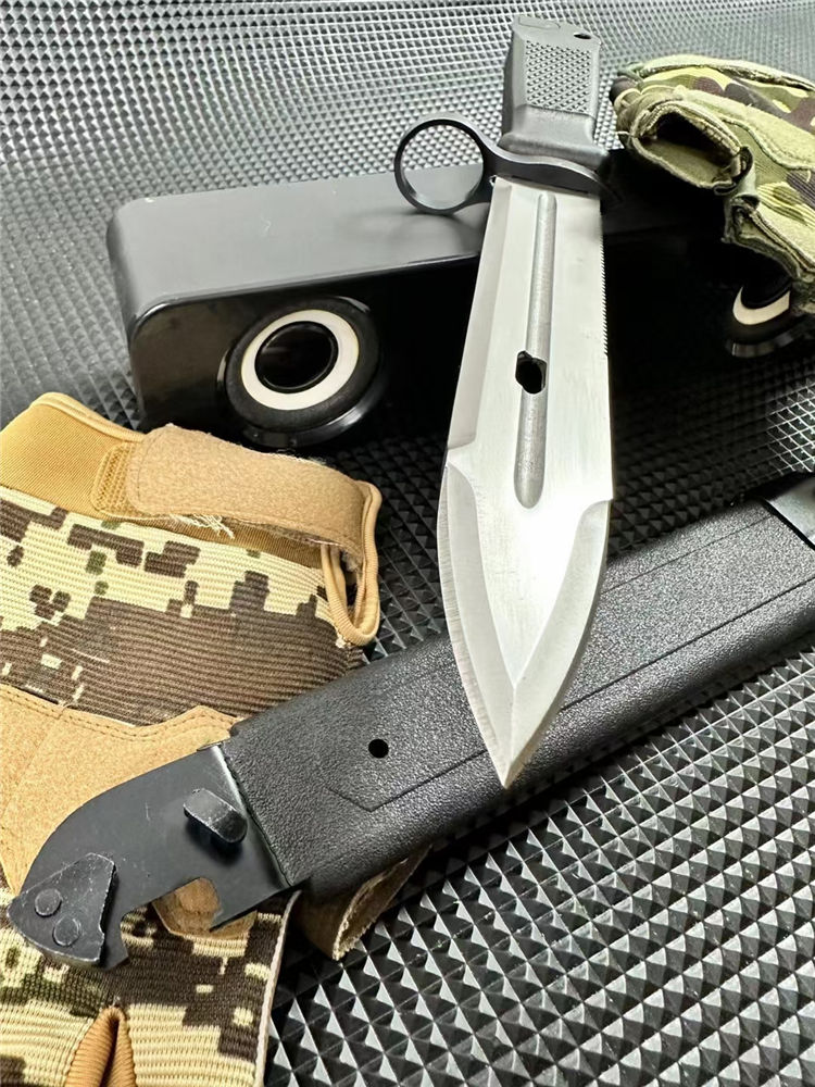 材质 高铬合金不锈钢 87式多用途刺刀具有剪、锯、锉、砍等多种功能,装在枪上可进行拼刺。由于刺刀在使用时,要求耐磨、强度好、潮湿气候不生锈等,热处理硬度为HRC53~57,可用于87枪