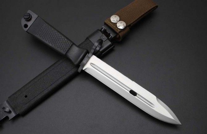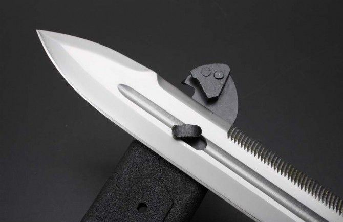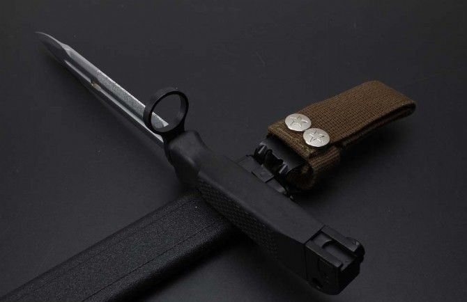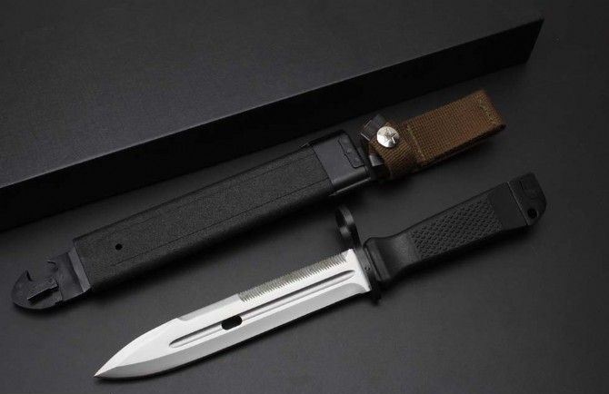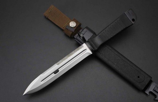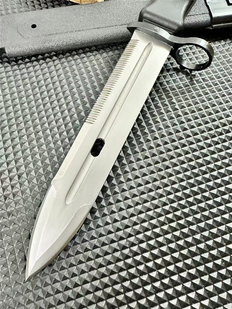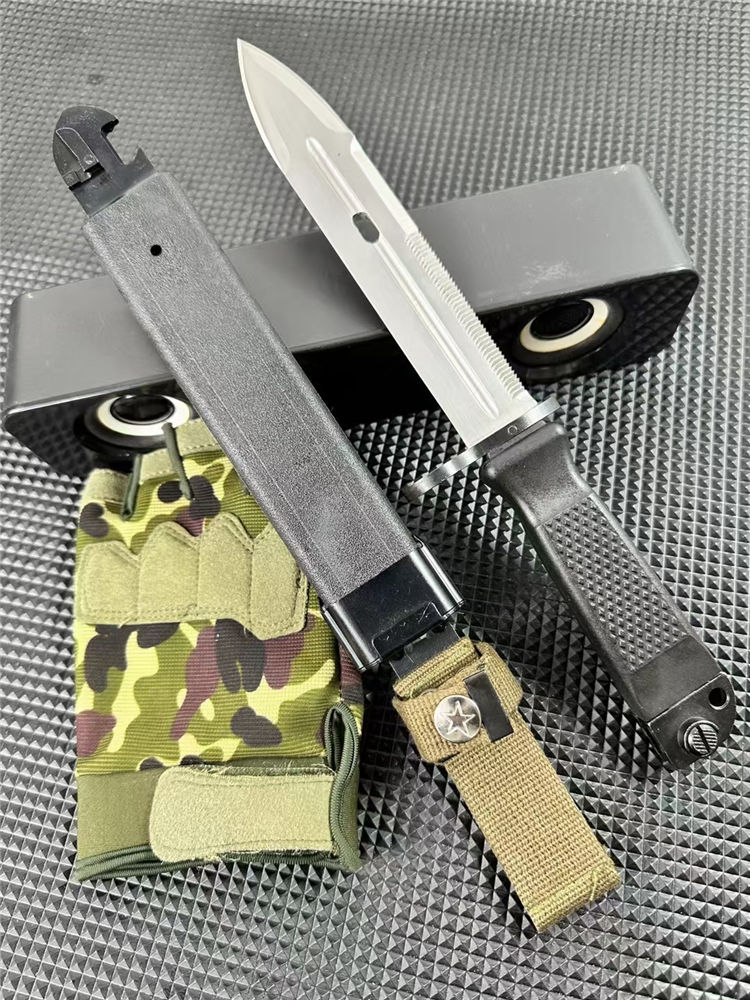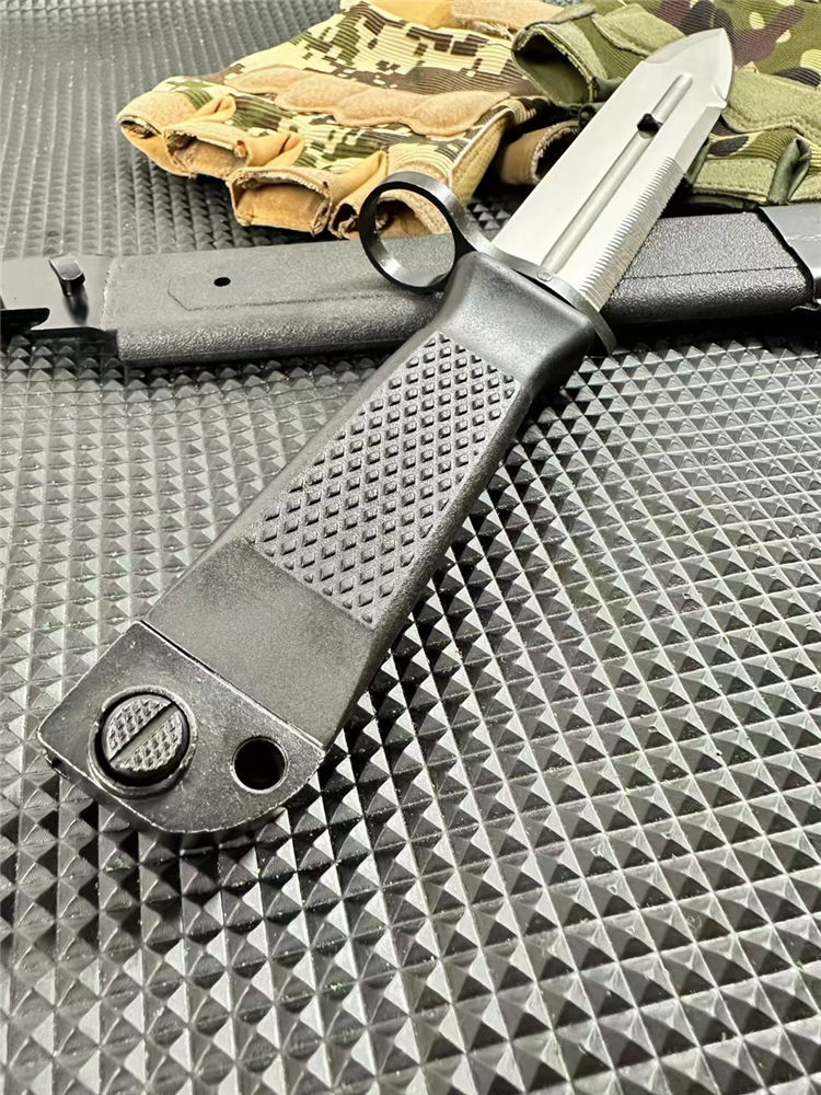 材质 高铬合金不锈钢 87式多用途刺刀具有剪、锯、锉、砍等多种功能,装在枪上可进行拼刺。由于刺刀在使用时,要求耐磨、强度好、潮湿气候不生锈等,热处理硬度为HRC53~57,可用于87枪