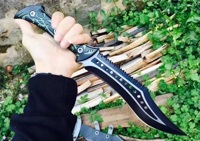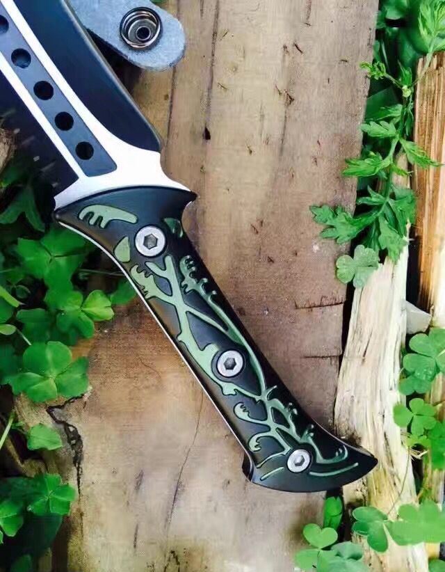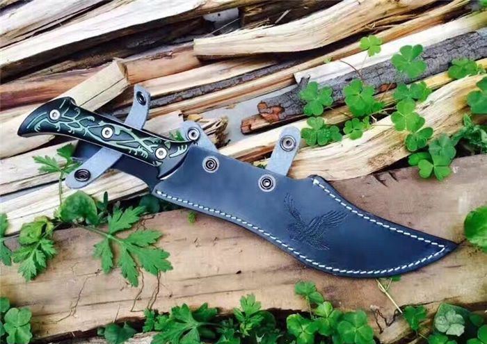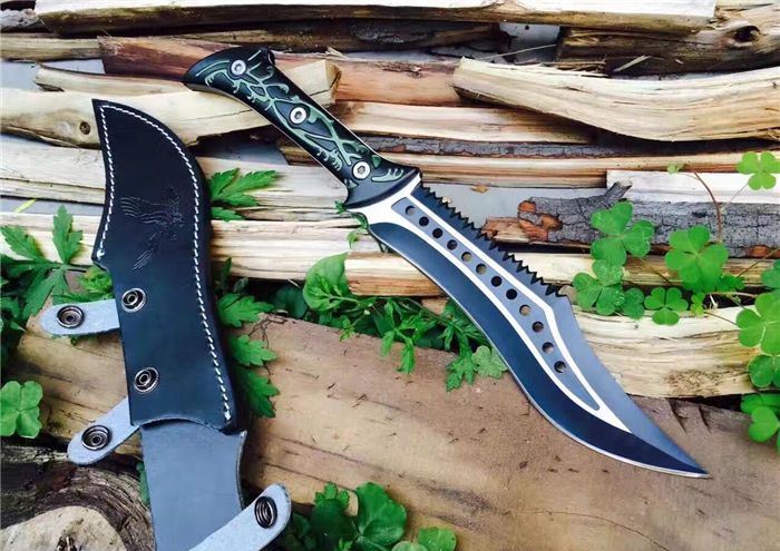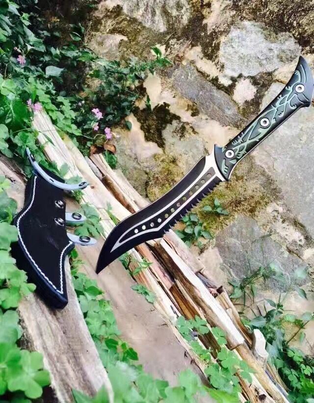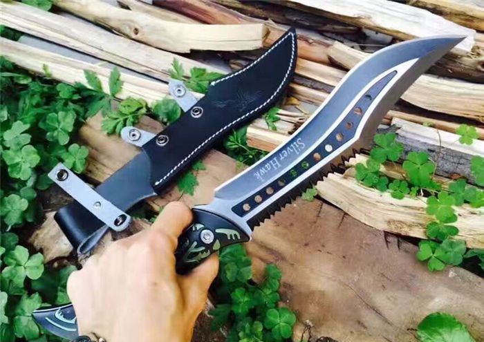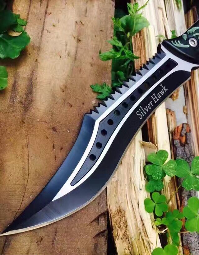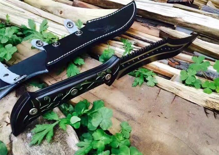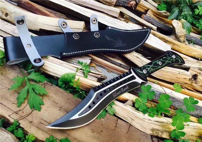 飞鹰战术直刀 全长:35.5cm 刃长:23cm 柄长:12cm 最宽处:5.5cm 刃厚:0.6cm 重量:560g 配送牛皮套