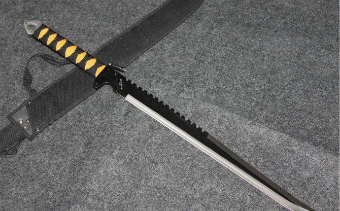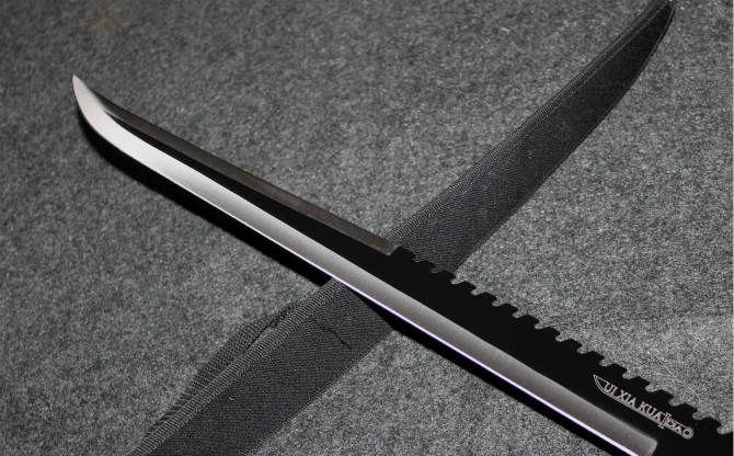 JL勇士丛林黑色开山刀 全长:70.5cm 刃长:46cm 柄长:21cm 刃厚:0.3MM 总重:500克 刃材:420高级不锈钢 硬度:53-55 刀套:尼龙面料 野营户外快速武器,以轻而快迅速制服各种动物,而且有照明灯