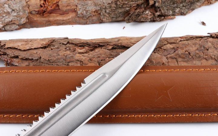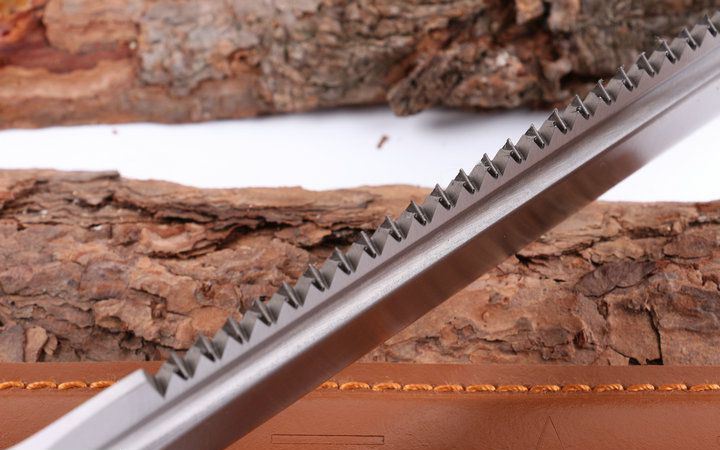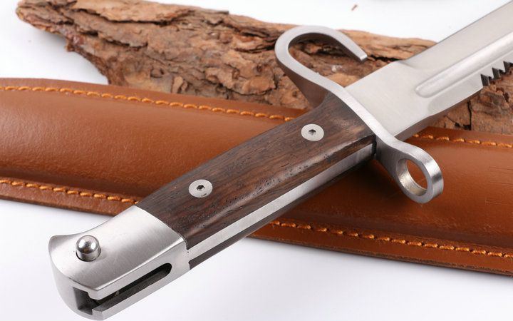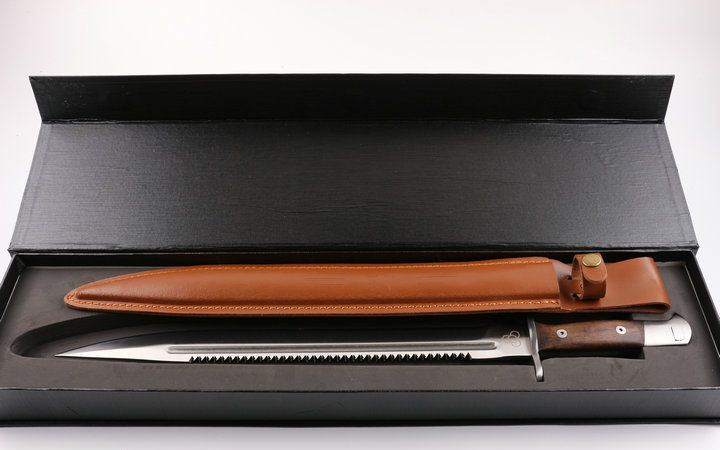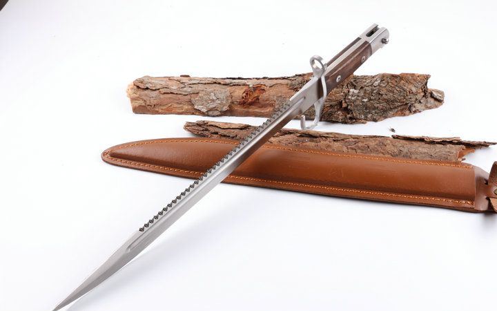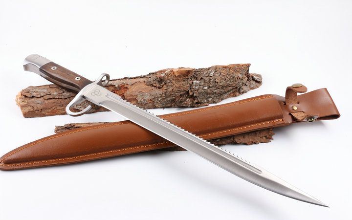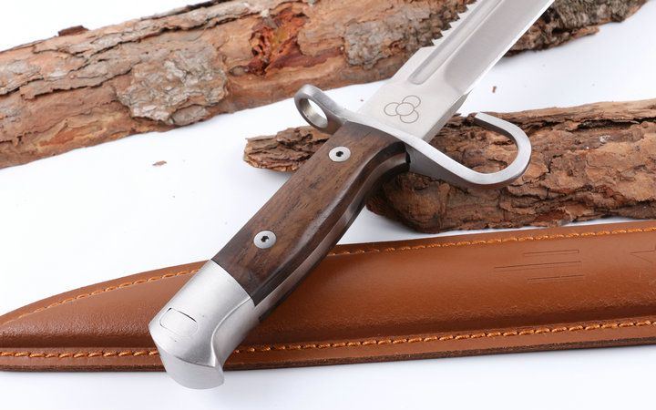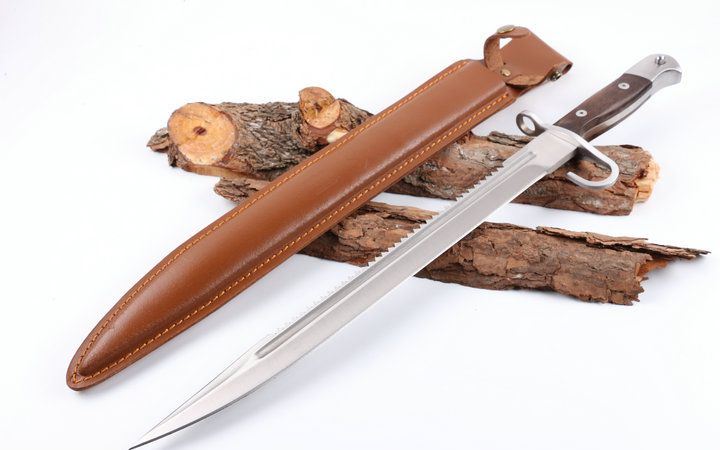德国背齿军刺 全 长:50cm 刃 长:37.5cm 柄 长:12.5cm 刃 宽:3.1cm(最宽处) 刃 厚:6.4mm 刃 材:5CR13MOV 硬 度:56-58HRC 刀 柄:加厚钢尾,护手和酸枝木组成 表 面:沙光 刀 重:620克 重 量:1256克(含包装) 备 注:原厂礼品盒,优质皮套